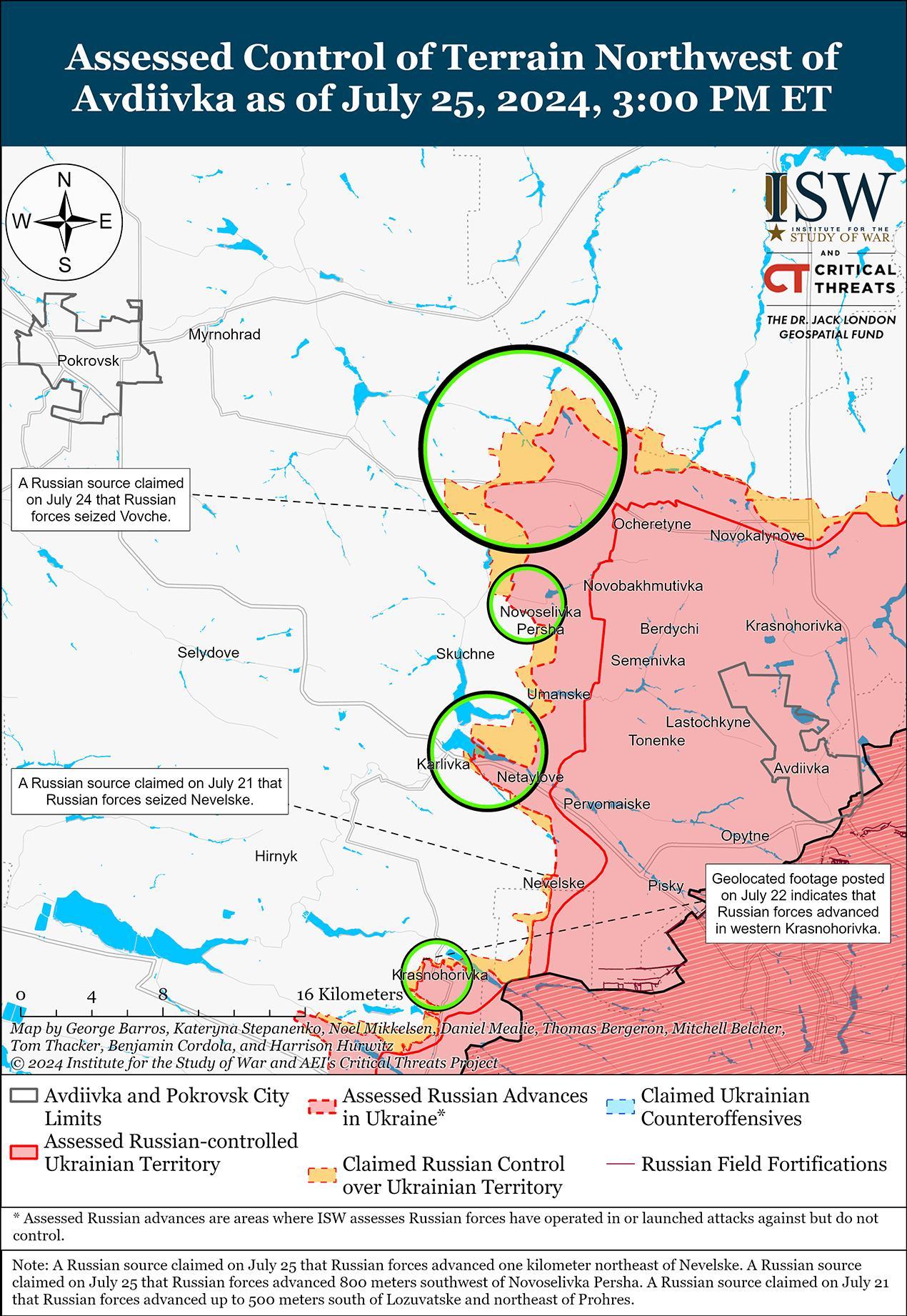 25 июля российские войска незначительно продвинулись к северу от Харькова на фоне продолжающихся штурмов к северу и северо-востоку от Харькова. Геолоцированные кадры, опубликованные 24 июля, указывают на то, что российские войска в последнее время незначительно продвинулись к северу от Глубокого (к северу от Харькова). [42] Российский военный блогер утверждал, что российские войска захватили все Глубокое за последние 24 часа, однако ISW не обнаружил подтверждений действий российских войск в западной части населенного пункта. [43] Российские и украинские источники сообщали, что бои продолжаются к северу от Харькова в районе Глубокого и к северо-востоку от Харькова в районе Волчанска, а также в районе Старицы и Тихое. [44] По данным Генштаба Украины, за последние сутки российские войска выпустили 28 планирующих бомб по целям к северу от Харькова в районе Русской Лозовой, Питомника, Веселого, Липцов и Глубокого, а также к северо-востоку от Харькова в районе Старицы и Волчанских хуторов. [45]