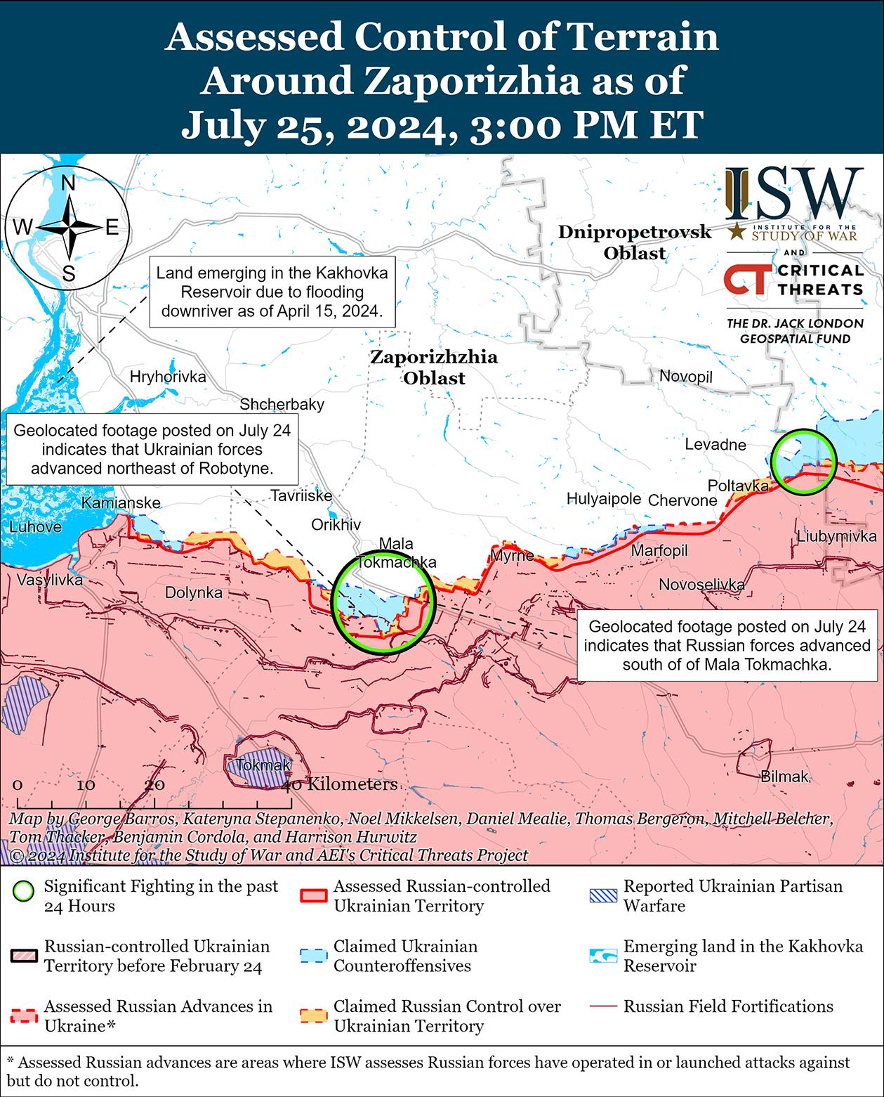 25 июля российские и украинские войска незначительно продвинулись вперед на фоне продолжающихся позиционных боев на западе Запорожской области. На геолоцированных кадрах, опубликованных 24 июля, видно, что украинские войска незначительно продвинулись к северо-востоку от Работино, а российские войска незначительно продвинулись к югу от Малой Токмачки (к северо-востоку от Работино). [63] Российский военный блогер утверждал, что российские войска продвинулись в полях еще южнее Малой Токмачки и оттеснили украинские войска от трассы Н-08 Орехов-Пологи, но в ISW не обнаружили подтверждения этому заявлению. [64] 24 и 25 июля враг продолжил наземные атаки вблизи Работино, Малой Токмачки и к северо-западу от Работино в районе Юрковки, Новоандреевки и Щербаков. [65] Пресс-секретарь Таврийской группировки войск капитан Дмитрий Лиховой заявил 24 июля, что в общей сложности российские войска сосредоточили 90 000 человек личного состава на разных направлениях и по всей глубине российской обороны в Запорожской области. [66] Лиховой подчеркнул, что украинские войска не выявили, чтобы российские войска формировали наступательную группировку в Запорожской области. Сообщается, что подразделения российской 7-й воздушно-десантной дивизии (ВДВ) ведут бои к юго-западу от Новопокровки (к северо-востоку от Работино), а подразделения российских 1429-го и 1430-го мотострелковых полков (58-я общевойсковая армия, Южный военный округ) действуют в районе Работино. [67]