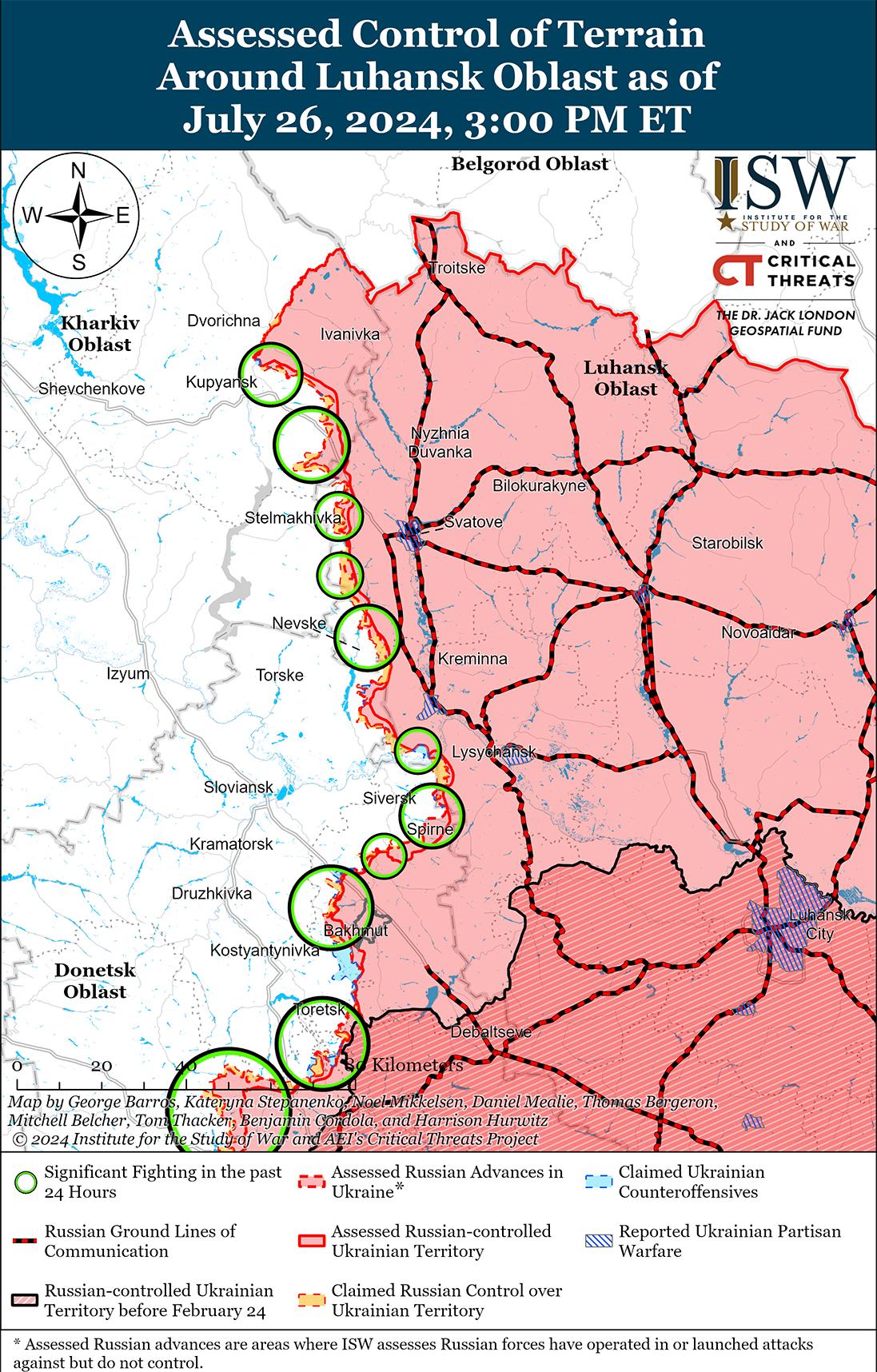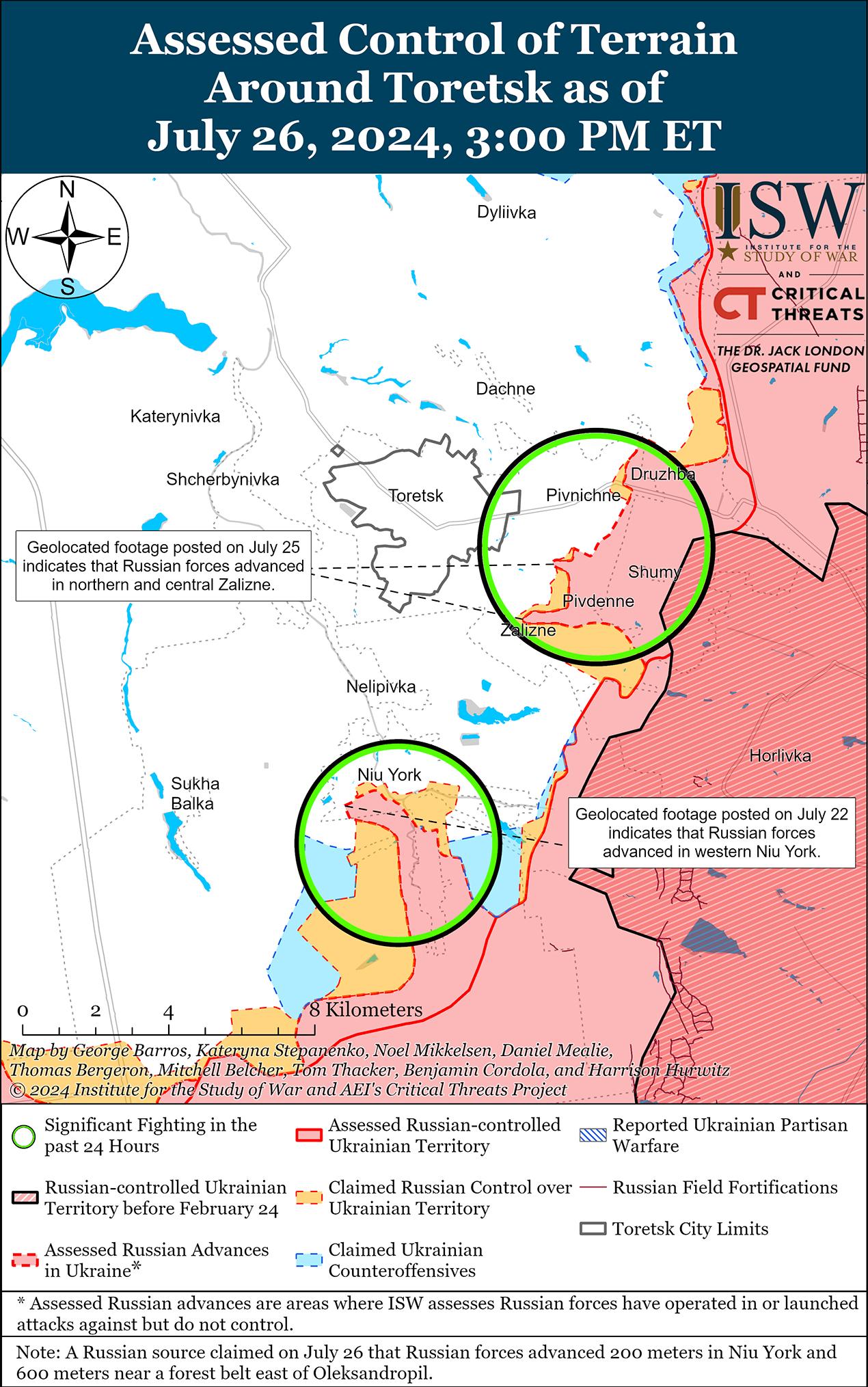 Сообщается, что 26 июля российские войска продвинулись под Торецком, но подтвержденных изменений на линии фронта в этом районе не было. Российские военные блогеры утверждают, что российские войска продвинулись на 200 метров в районе Ню-Йорка (к югу от Торецка), на 600 метров в направлении Александрополя (к юго-западу от Торецка), к юго-западу от Юрьевки (к югу от Торецка), а также в районах Северное и Железное (оба к востоку от Торецка). [49] Однако ISW не обнаружил подтверждения этих российских заявлений. 25 и 26 июля враг продолжил наступательные действия к востоку от Торецка в районе Северного и Дружбы, к юго-востоку от Торецка в районе Железного и к югу от Торецка в районе Ню-Йорка. [50]