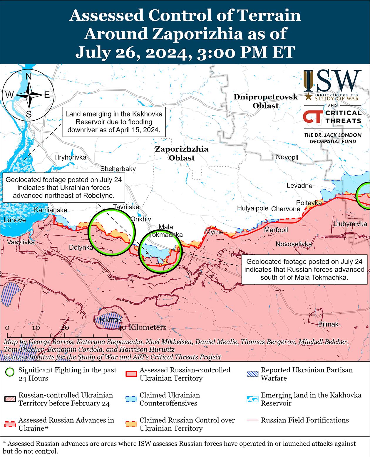 Сообщается, что 25 июля российские войска провели еще одну механизированную атаку на Кураховском направлении (к западу и юго-западу от Донецка) после усиленного батальонного штурма российских войск 24 июля в районе Константиновки, в результате которого были понесены значительные потери техники. Украинская бригада, которая оборонялась от атаки 24 июля, позже заявила, что 25 июля российские войска провели усиленную механизированную атаку численностью до роты с использованием трех танков, 13 боевых бронированных машин, 12 мотоциклов и около 200 человек личного состава на Кураховском направлении и что украинские войска уничтожили один танк и две боевые бронированные машины. [60] ISW продолжает считать, что готовность российского военного командования расходовать большое количество бронетехники на ограниченные тактические задачи отражает плохое долгосрочное оперативное предвидение и что ограничения на российскую технику в среднесрочной и долгосрочной перспективе со временем сделают такие неудачные механизированные атаки более дорогостоящими. [61]