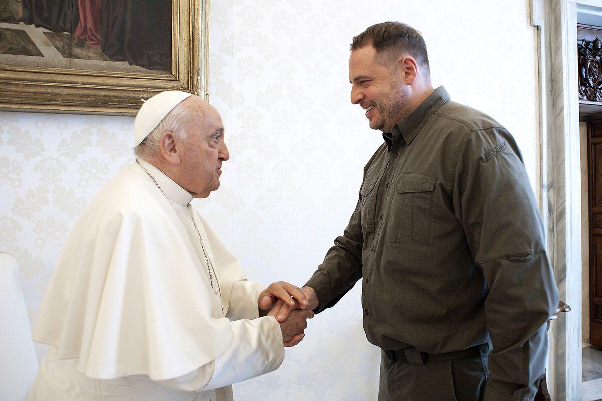 Єрмак під час аудієнції у Папи Франциска в Апостольському палаці у Ватикані у червні. Джерело: Vatican Media/Vatican Pool/Getty Images