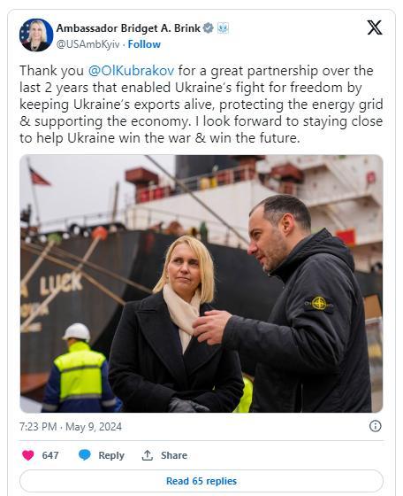 Примітно, що посол США в Україні Бріджіт Брінк опублікувала повідомлення у соціальній мережі X, у якому вихваляла Кубракова 9 травня, у день, коли міністра було відправлено у відставку на парламентських виборах. Брінк подякував Кубракову «за відмінне партнерство» протягом останніх двох років, коли він працював над підтримкою експорту, енергетичної інфраструктури та економічного зростання України.