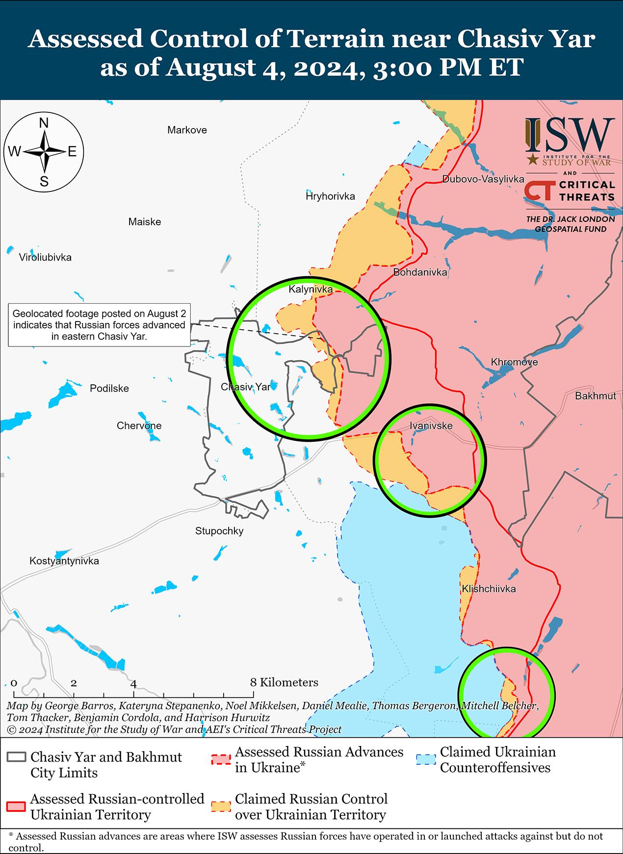 2 августа враг продолжил наступательные действия в районе Часова Яра, но подтвержденных изменений на линии фронта не было. Российские источники продолжили обсуждать российские боевые действия в микрорайоне Жовтневый (восток Часова Яра) и заявили, что российские войска зачищают недавно захваченные позиции в этом районе. [21] Российские военные блогеры утверждали, что российские войска продвинулись к северу от Часового Яра в районе Калиновки, и утверждали, что российские войска захватили украинский опорный пункт на ключевой высоте к юго-востоку от Часов Яра в районе Клещеевки, хотя ISW не зафиксировал подтверждения этих заявлений. [22] Российские войска продолжили наступательные действия вблизи Калиновки; к северо-востоку от Часова Яра в районе Васюковки; восточнее Часова Яра в районе Ивановского; к юго-востоку от Часова Яра в районе Клещеевки и Андреевки; и южнее Часова Яра в районе Ступочки 3 и 4 августа. [23] Глава Чеченской Республики Рамзан Кадыров опубликовал кадры, на которых якобы запечатлены элементы отряда «Шустрый» чеченского спецназа «Ахмат» и российской 4-й мотострелковой бригады (2-й АК ЛНР), действующих на направлении Часов Яр. [24]
