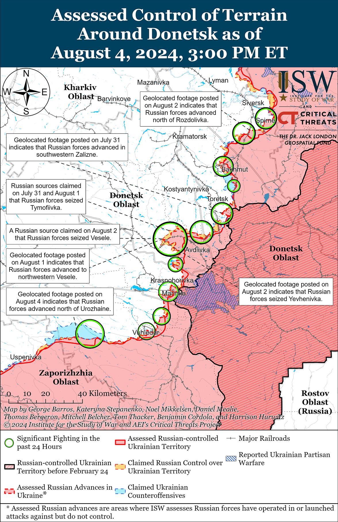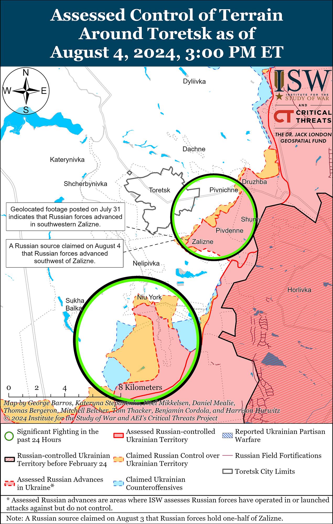 Сообщается, что российские войска продвинулись к юго-востоку от Торецка, но 4 августа никаких подтвержденных изменений в линии фронта в этом районе не было. Российские военные блогеры утверждают, что российские войска продвинулись на расстояние до километра к западу от юго-западного Железного (к юго-востоку от Торецка) и вошли в административные границы Торецка, хотя ISW не зафиксировал подтверждения этих заявлений. [25] 3 и 4 августа российские войска продолжали наступательные действия вблизи Торецка, к востоку от Торецка в районе Северного, к юго-востоку от Торецка в районе Железного, к югу от Торецка в районе Нью-Йорка и к юго-западу от Торецка в районе Пантелеймоновки. [26]