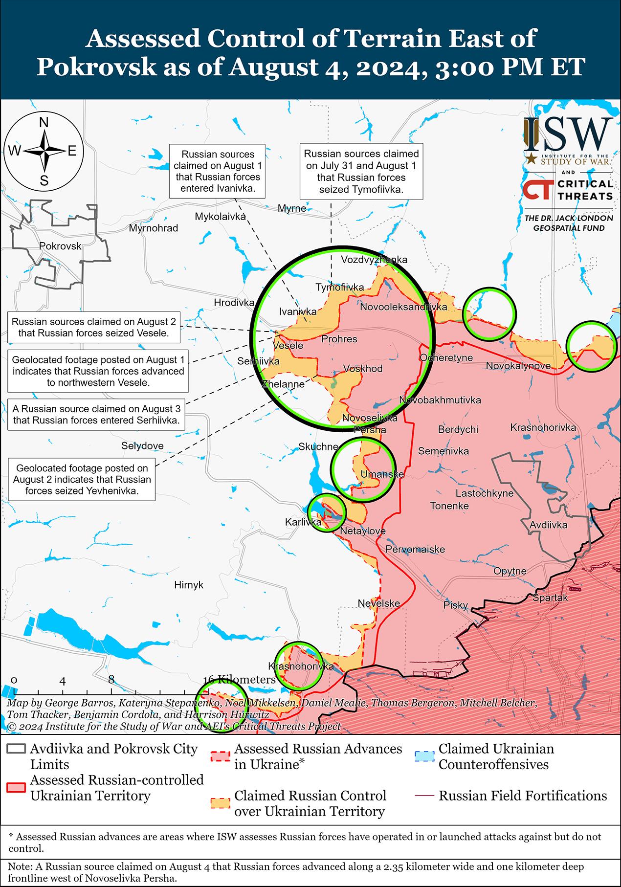 Российские войска недавно продвинулись к востоку от Покровска и, как сообщается, 4 августа добились дальнейших успехов в этом районе. Геолоцированные кадры, опубликованные 4 августа, свидетельствуют о том, что в последнее время российские войска продвинулись дальше в районе Веселого (к востоку от Покровска) и захватили большую часть населенного пункта. [27] Министерство обороны России заявило 4 августа, что элементы Центральной группировки войск РФ захватили Новоселовку Первую (юго-восток от Покровска), но, по оценкам ISW, российские войска захватили населенный пункт по состоянию на 29 июля. [28] Российские военные блогеры утверждали, что российские войска продвинулись на расстояние до километра в глубину и 2,35 километра по фронту к западу от Новоселовки Первой в сторону Межового (к юго-востоку от Покровска) и продвинулись дальше в Ивановке (к востоку от Покровска). [29] Российский военный блогер заявил, что российские войска вошли на северо-восточную окраину Желанного (к юго-востоку от Покровска) и приближаются к северо-западным окраинам населенного пункта. [30] Российские войска продолжали наступательные действия к северо-востоку от Покровска в районе Воздвиженки; к востоку от Покровска в районах Калиново, Новоалександровки, Гродовки, Веселого, Свиридоновки, Тимофеевки, Лисичного, Ивановки; и юго-восточнее Покровска в районе Новогродовки, Новоселовки Первой, Желанного, Сергеевки, Межового, Скучного, Яснобродовки и Карловки 3 и 4 августа. [31] Представитель украинской бригады, действующей на Покровском направлении, заявил, что российские войска редко проводят механизированные атаки в этом районе и с июня 2024 года полагаются на тактику тяжелой пехоты. [32] Сообщается, что на Покровском направлении действуют подразделения российской 74-й мотострелковой бригады (41-я общевойсковая армия, Центральный военный округ). [33]