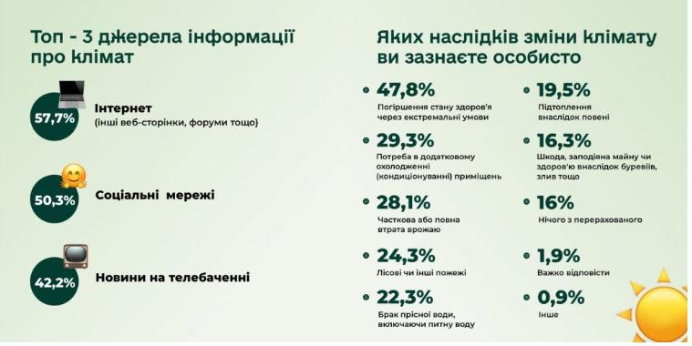 - майже кожен мешканець України відчуває вплив зміни клімату на його місцевість: 24,2% відчувають сильний вплив, 64,8% – помірний;
