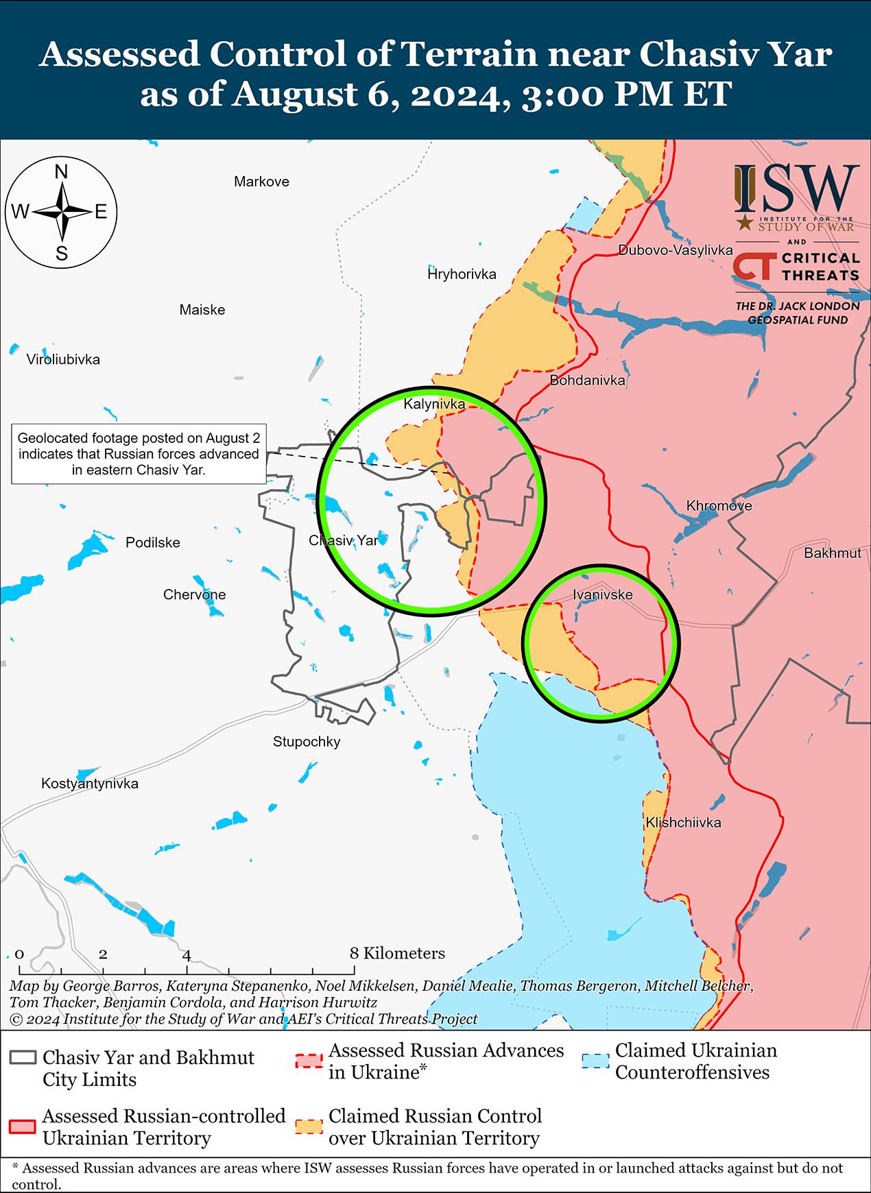 В последнее время российские войска продвинулись под Торецком на фоне продолжающихся наступательных действий в этом районе 5 августа. Геолоцированные кадры, опубликованные 5 августа, указывают на то, что российские войска недавно незначительно продвинулись к улице Достоевского на северо-западе Северного (к востоку от Торецка). [37] На дополнительных геолоцированных кадрах, опубликованных 6 августа, видно, как военнослужащие 9-й мотострелковой бригады, 1-й АК ДНР поднимают флаг над зданием на улице Гагарина на северо-западе Нью-Йорка (к югу от Торецка), что указывает на то, что российские войска в последнее время продвинулись вглубь населенного пункта. [38] Российские источники утверждали, что российские войска продвинулись дальше в Ню-Йорк и захватили поселение, хотя ISW не обнаружил визуального подтверждения этого максималистского заявления. [39] Российские военные блогеры утверждали, что российские войска продвинулись на участке по фронту 1,6 км и глубиной до 800 м в восточной части Северного, а также в Дружбе (к востоку от Торецка) и Железном (к юго-востоку от Торецка). [40] Некоторые российские источники повторяли утверждения о том, что российские войска могут окружить украинские войска в восточной части Нью-Йорка, но один российский военный блогер опроверг эти утверждения и заявил, что российские войска продвигаются в этом районе слишком медленно, чтобы окружить украинские силы. [41] 5 и 6 августа враг также вел атаки вблизи Пантелеймоновки (к югу от Торецка). [42] Сообщается, что подразделения батальона «Лавина» российской 132-й мотострелковой бригады (1-го АК ДНР) действуют вблизи Горловки (к востоку от Торецка). [43]