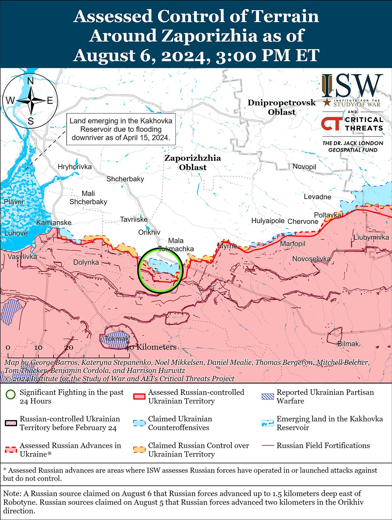 Глава оккупационной администрации Херсонской области Владимир Сальдо и другие российские источники заявили 6 августа, что украинские силы провели рейд на оккупированную Тендровскую косу в Херсонской области. Российские источники утверждают, что российские морские пехотинцы отразили попытку высадки 10–12 украинских катеров на косе и уничтожили несколько украинских катеров.[61] ISW не обнаружил подтверждения этим заявлениям.