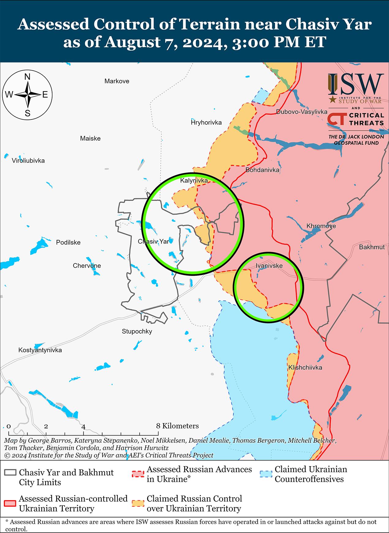Украинские войска недавно отбили ограниченные позиции в районе Часова Яра на фоне продолжающихся российских наступательных действий в этом районе 7 августа. Геолоцированные кадры, снятые в неустановленную дату и опубликованные 7 августа, указывают на то, что украинские силы незначительно продвинулись через канал Северский Донец – Донбасс и отбили некоторые позиции в лесном массиве Ступки Голубовские-2 к югу от Часов Яра, хотя, вероятно, не в течение последних суток. [57] Продолжались бои в Новом и Жовтневом микрорайонах Часового Яра; к северу от Часов Яра в Орловском лесничестве (к северу от микрорайона Жовтневый); и восточнее Часова Яра в районе Ивановского. [58]