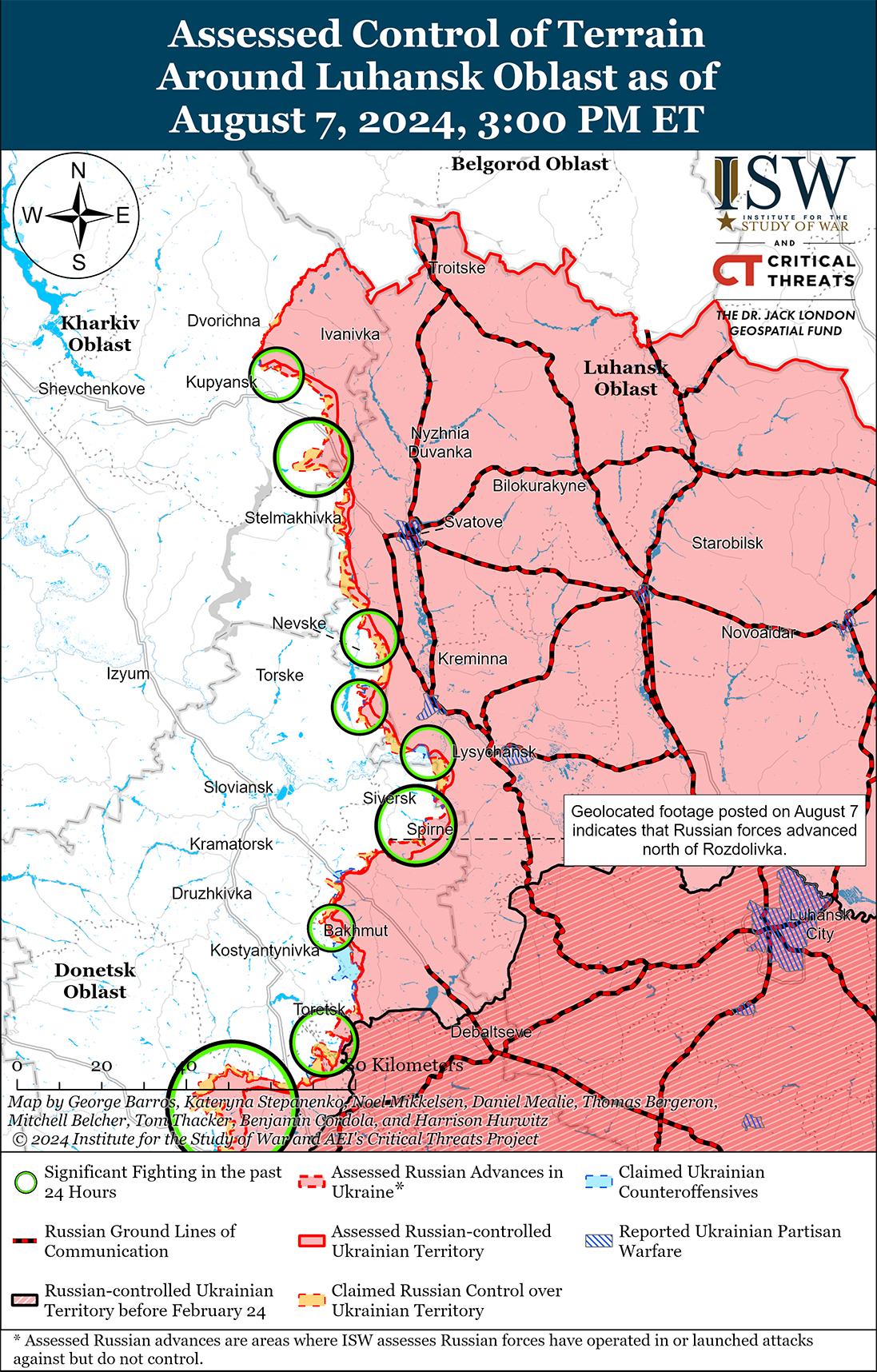 7 августа на севере Харьковской области продолжались ограниченные позиционные бои, но подтвержденных изменений на линии фронта не было. Российские военные блогеры утверждают, что украинские войска перебрасывают дополнительную живую силу и проводят контратаки вблизи Глубокого (к северу от Харькова) и в районе Волчанска (к северо-востоку от Харькова). [46] Российский военный блогер утверждал, что российские войска зачищают здания в высотном районе Волчанска и продвинулись на 100 метров в южной части населенного пункта, хотя в ISW не зафиксировано визуального подтверждения этого заявления. [47] Харьковская группировка войск Украины сообщила, что российские войска наращивают огонь артиллерии на Волчанском направлении. [48] В Харьковской группировке войск также отметили, что в этом районе враг применяет термобарические артиллерийские установки ТОС-1А. [49] Генеральный штаб Украины сообщал о боях под Липцами, Волчанском и Тихое (к востоку от Волчанска). [50] Сообщается, что на территории Волчанска действуют подразделения 4-й добровольческой штурмовой бригады и отряда «Штурм» 153-го танкового полка (оба входят в состав 47-й танковой дивизии 1-й гвардейской танковой армии Московского военного округа) и 138-й мотострелковой бригады (6-я общевойсковая армия Ленинградского военного округа). [51] Украинский военный обозреватель Константин Машовец отметил, что основные силы Северной группировки войск (СГ) России в настоящее время все еще дислоцированы в Харьковской области, подчеркнув, что они еще не развернуты для ответа на продолжающиеся украинские действия в Курской области. [52] Машовец заявил, что эти элементы Северной группировки включают в себя обе бригады 6-й ОА (138-я и 25-я мотострелковые бригады), большую часть 44-го армейского корпуса (ЛВО) и большую часть 11-го армейского корпуса (ЛВО), а также 155-ю бригаду морской пехоты (Тихоокеанский флот), 83-ю воздушно-десантную бригаду (ВДВ) и 2-ю бригаду спецназа (Главное управление Генерального штаба России [ГРУ]) общей численностью от 72 000 до 75 000 человек.