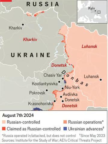 О летнем наступлении России, в отличие от контрнаступления Украины в прошлом году, так и не было объявлено. Самая интенсивная его фаза уже три месяца идет на Донбассе и в Харьковской области. Столкнувшись с нехваткой оружия и людей, Украина неуклонно теряла позиции после отступления от Авдеевки в феврале: здесь село, там неумелая ротация. В настоящее время она отступает на 1 км в день. Бои активизировались по всей линии фронта. 30 июля президент Владимир Зеленский заявил, что Покровск, город с населением 60 000 человек до войны, стал главной целью России