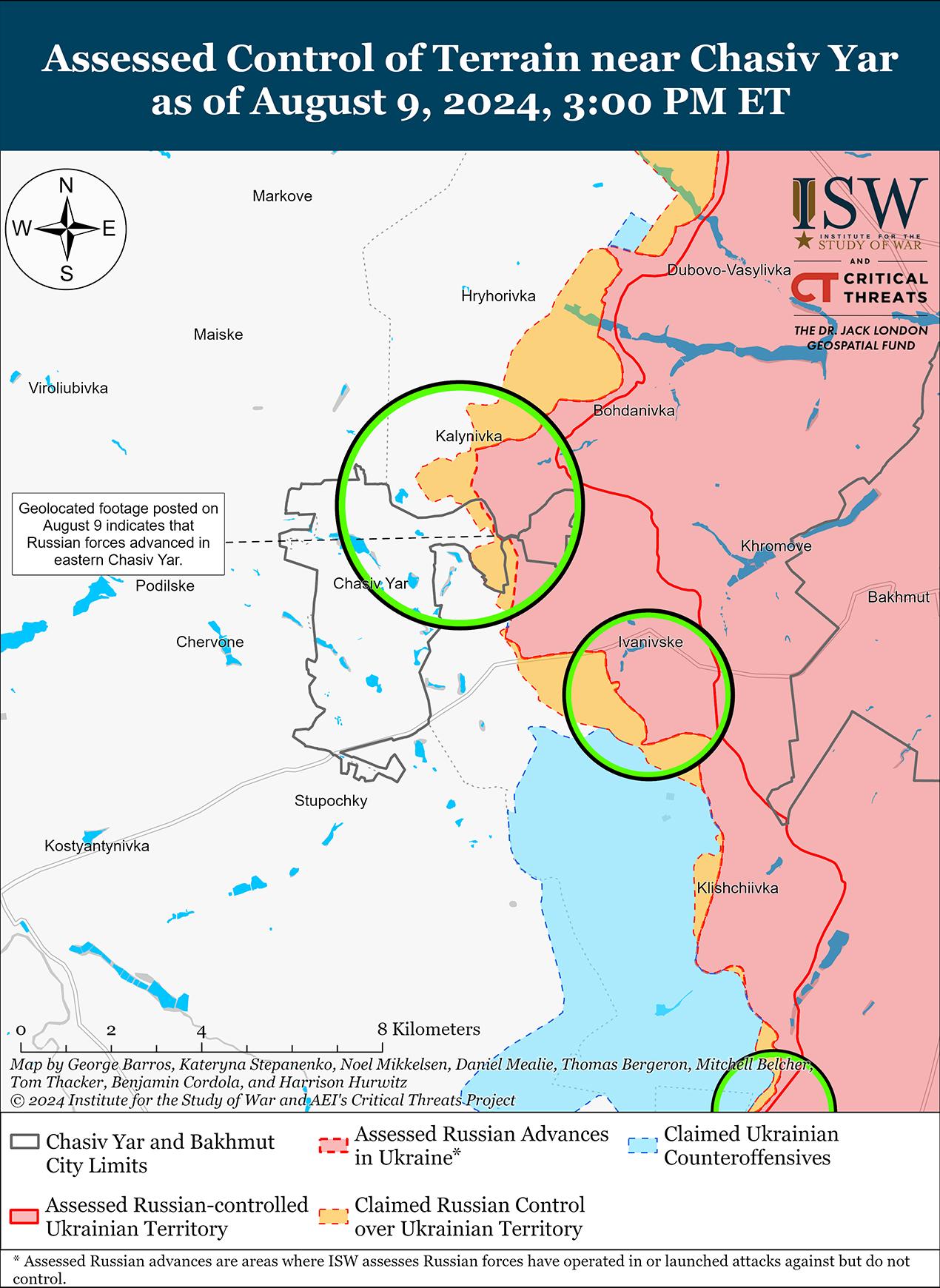 В последнее время российские войска незначительно продвинулись в Часовом Яру и вблизи него на фоне продолжающихся наступательных действий в этом районе 9 августа. Геолоцированные кадры, опубликованные 9 августа, свидетельствуют о том, что российские войска в последнее время незначительно продвинулись вдоль улицы Лесной в Калиновке (к северу от Часов Яра) и далее к западу от канала Северский Донец – Донбасс в Жовтневом микрорайоне (восток Часового Яра). [47] Российские войска продолжили наступательные действия в Новом микрорайоне на востоке Часова Яра; к востоку от Часова Яра в районе Ивановки; и к югу от Часова Яра в районе Ступочек, Белой Горы и Дилиевки 8 и 9 августа. [48]