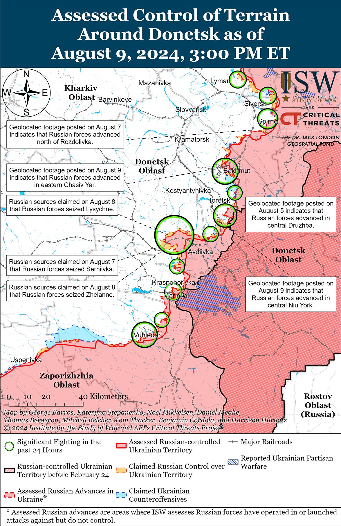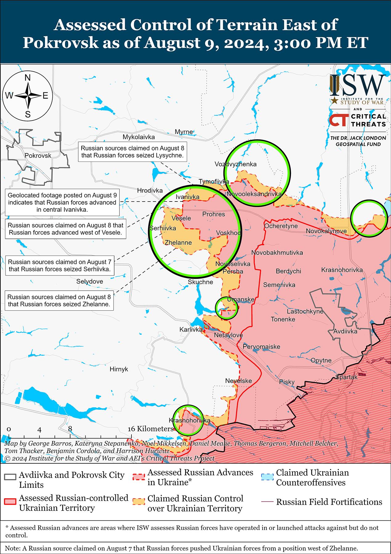 Российские войска недавно продвинулись к востоку от Покровска на фоне продолжающихся наступательных действий в этом районе 9 августа. Геолоцированные кадры, опубликованные 9 августа, указывают на то, что российские войска недавно продвинулись к западу от Новоалександровки и в Ивановке (оба к востоку от Покровска). [51] Российский военный блогер неоднократно утверждал, что российские войска продвинулись к северу от Сергеевки (к юго-востоку от Покровска) и вошли на восточную окраину Гродовки (к востоку от Покровска), однако в ISW не обнаружили визуального подтверждения этих заявлений. [52] Российский источник утверждал, что российские войска действуют в 10 км от Покровска, но ISW обнаружил только доказательства, подтверждающие, что российские войска продвинулись в пределах 17 км от Покровска. [53] 8 и 9 августа российские войска также атаковали к востоку от Покровска в районе Воздвиженки, Лисичного и Ивановки и к юго-востоку от Покровска в районе Желанного, Новоселовки Первой, Яснобродовки и Карловки. [54]