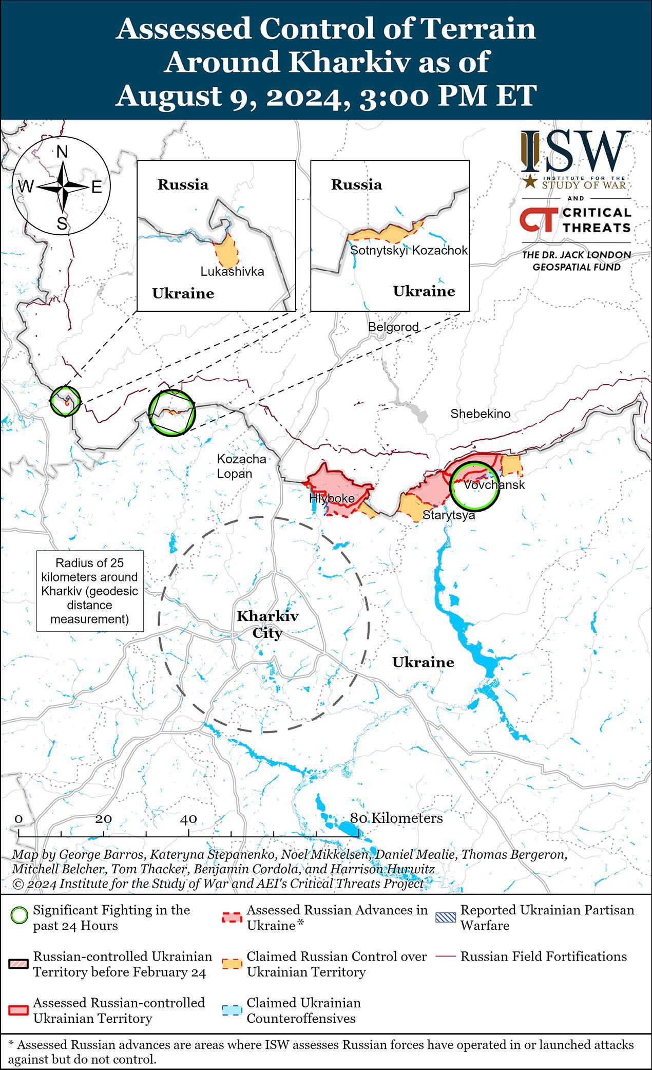 Сообщается, что 9 августа российские войска захватили приграничные населенные пункты к северо-западу от Харькова в Сумской и Харьковской областях, но ISW пока не зафиксировал подтверждения российских успехов в этих районах. Российские военные блогеры утверждали, что российские войска, в том числе подразделения чеченского отряда спецназа Ахмат «Аида», вели атаки в районе Сотницкого Казачка Харьковской области и захватили населенный пункт, а также вытеснили украинские войска из Лукашовки Сумской области. [41] В последнее время российские войска проводили небольшие диверсионно-разведывательные мероприятия в приграничных районах к северо-западу от Харькова в Харьковской и Сумской областях, но российские источники могут преувеличивать эти сообщения, чтобы отвлечь внимание от украинского вторжения в Курскую область. [42]