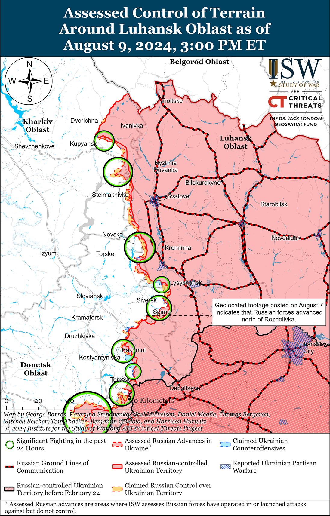 Российские источники заявили 9 августа, что украинские войска продвинулись дальше на восток в Курской области, но, вероятно, больше не действуют так далеко на север или запад, как ранее заявляли российские источники 8 августа. 9 августа российский военный блогер заявил, что украинские войска провели очередное трансграничное вторжение к северо-востоку от Сум и продвинулись в сторону Кучерова (примерно в километре от международной границы), но не вошли в населенный пункт. [1] Российский военный блогер заявил, что украинские войска в Курской области продвинулись на восток до Плехово (к юго-востоку от Суджи) на левом берегу реки Псёл. [2] ISW сокращает заявленный предел украинского наступления до Снагоста (к югу от Коренево), учитывая, что 8 августа российский военный блогер заявил, что российские войска начали зачистку населенного пункта. [3] ISW также сокращает заявленный предел украинского продвижения к северным окраинам Малой Локни (к северо-западу от Суджи и примерно в 13 километрах от международной границы), поскольку 9 августа российские военные блогеры заявили, что российские войска контратаковали вблизи населенного пункта. [4]