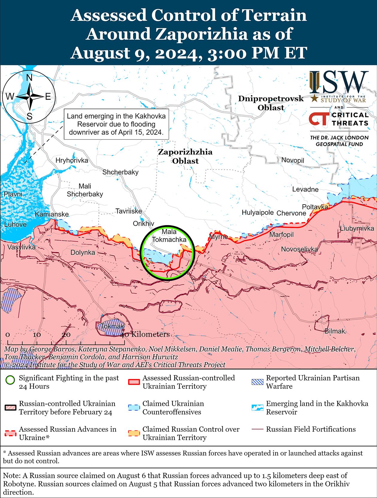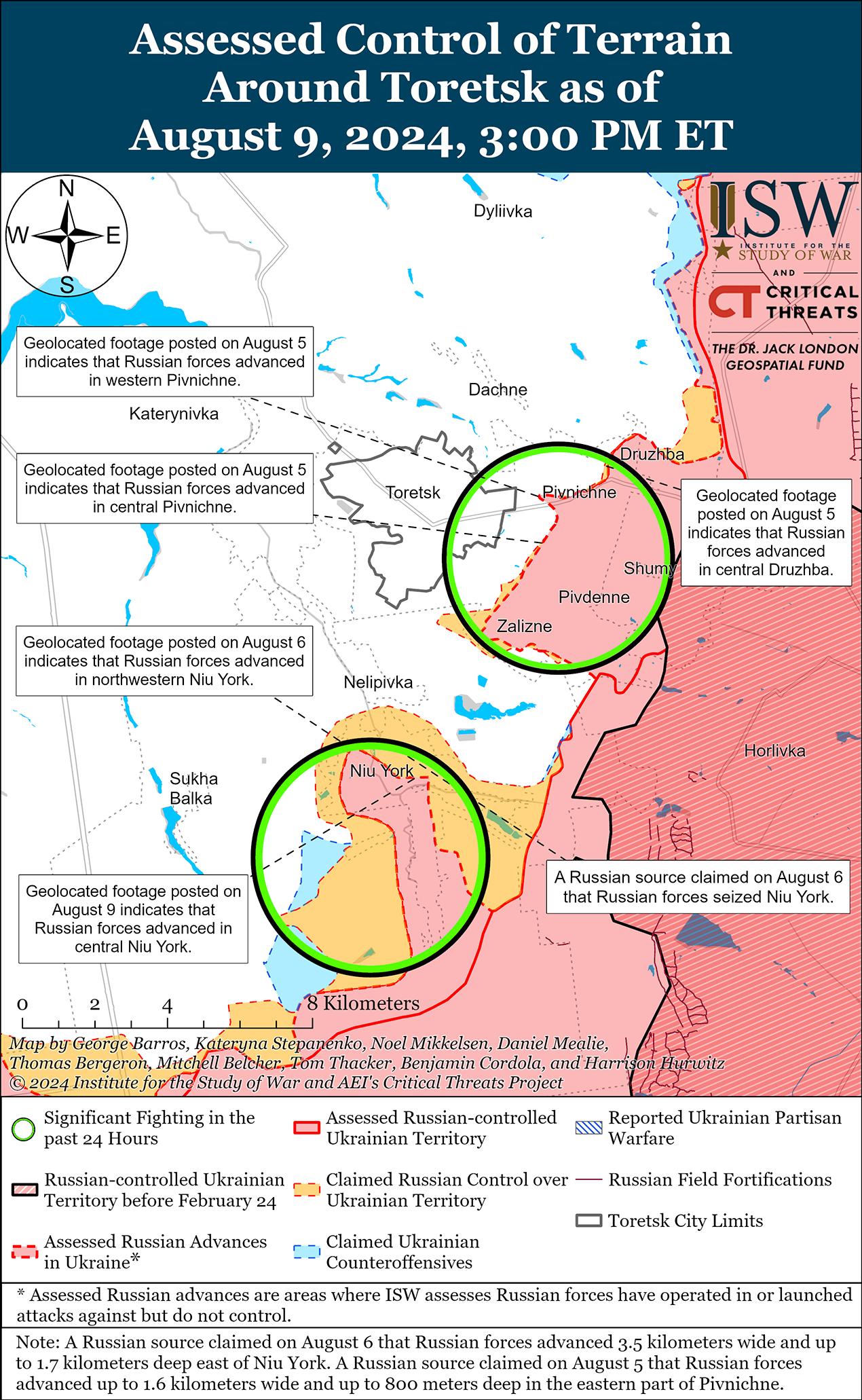 - Российские источники заявили 9 августа, что украинские войска продвинулись дальше на восток в Курской области, но, вероятно, больше не действуют так далеко на север или запад, как ранее заявляли российские источники 8 августа.