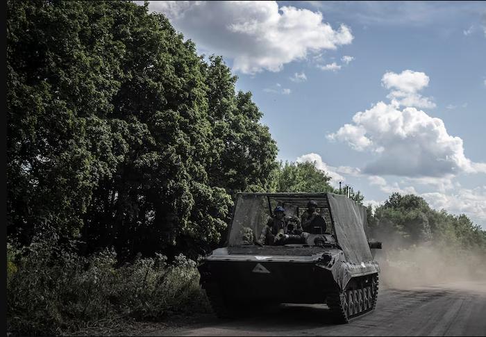 Украинские военнослужащие движутся на боевой машине пехоты БМП-1 у российской границы в Сумской области Украины в пятницу. (Вячеслав Ратынский/Reuters)