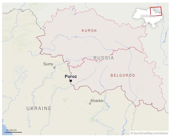 Бойцы 252-го батальона территориальной обороны Украины записали видео, опубликованное в субботу, стоя возле здания, идентифицированного как сельский клуб в Порозе — населенном пункте в Белгородской области России, расположенном менее чем в двух милях от границы. Washington Post не смогла сразу проверить подлинность видео или когда оно было записано.