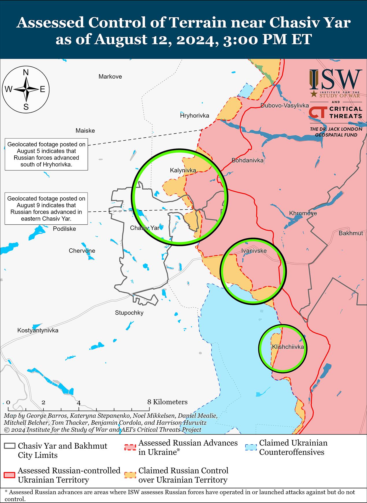 12 августа российские войска продвинулись к северу от Часова Яра на фоне продолжающихся боев в этом районе. На геолоцированных кадрах, опубликованных 5 августа, видно, что российские войска продвинулись к юго-востоку от Григорьевки (севернее Часова Яра). [39] 11 и 12 августа продолжались бои в районах Часов Яр, к северу от Часова Яра в районе Калиновки, к северо-востоку от Часова Яра в районе Богдановки и к юго-востоку от Часова Яра в районе Ивановского и Клещеевки. [40]