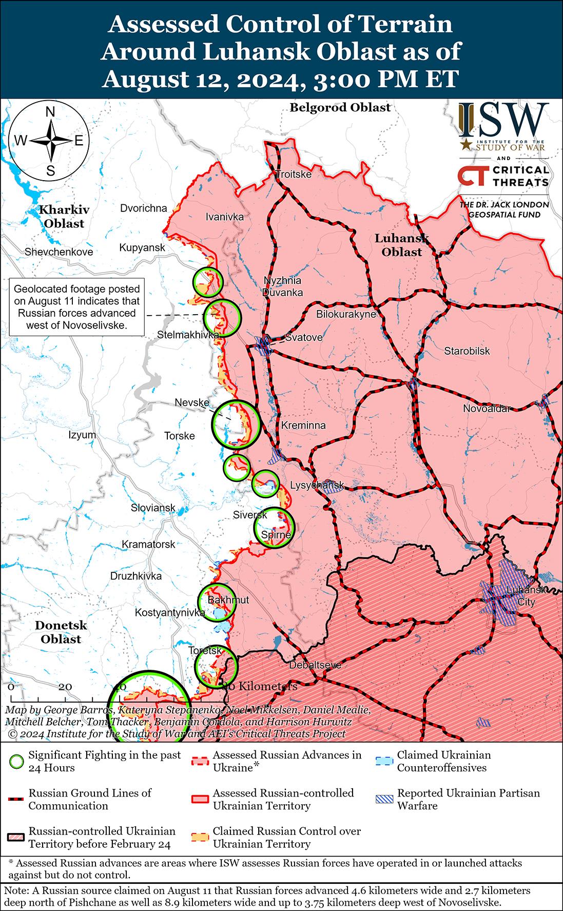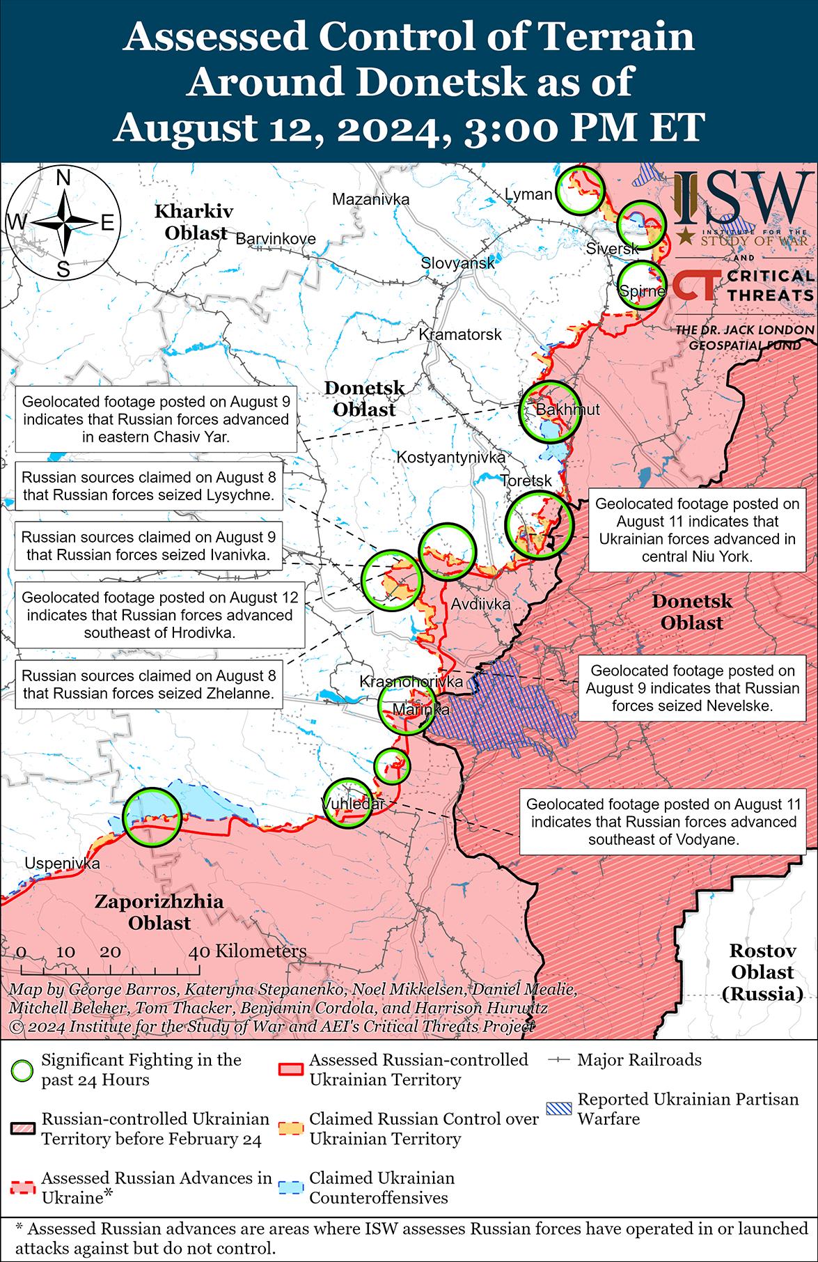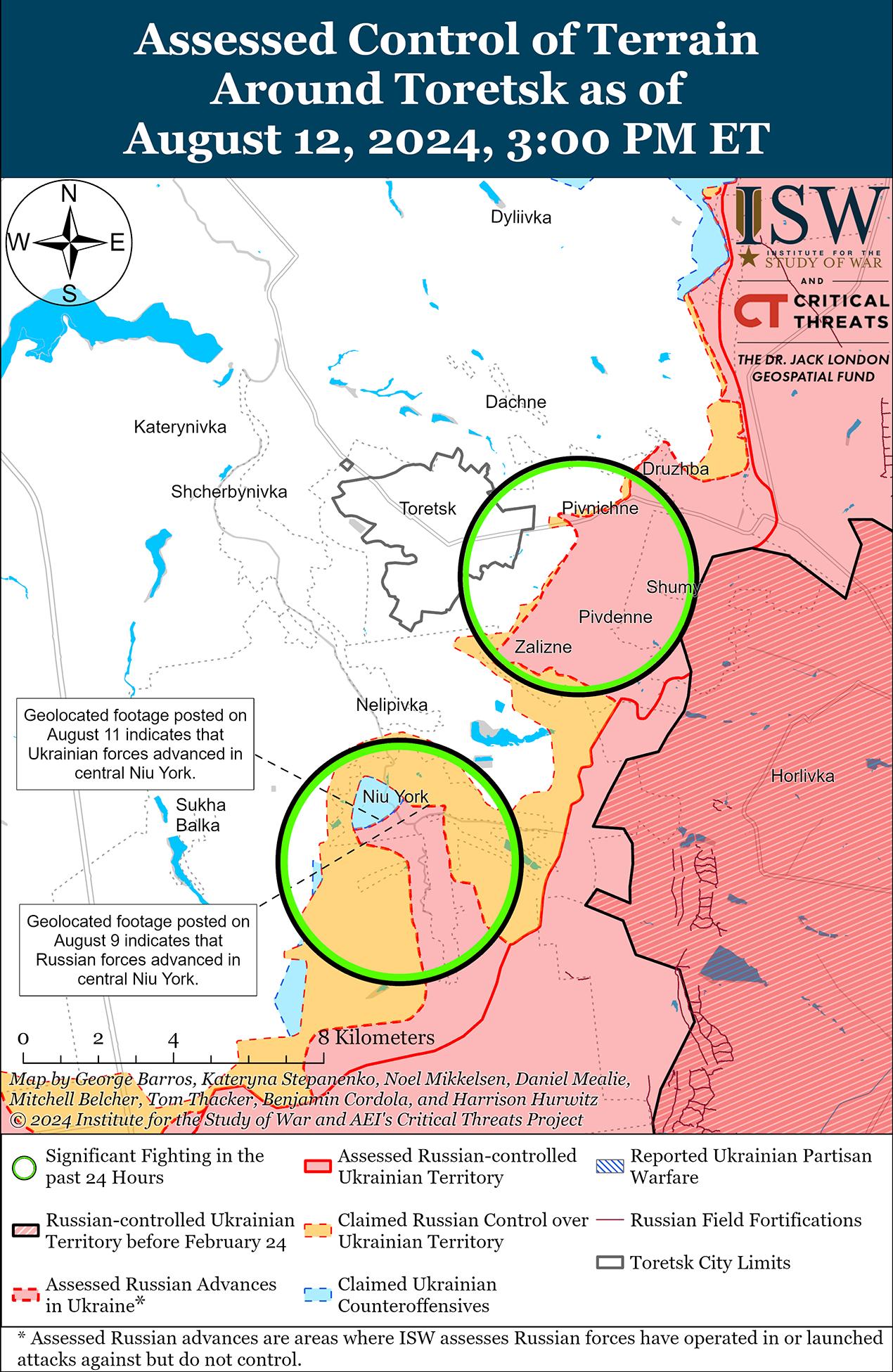 Российские войска недавно продвинулись к юго-востоку от Торецка, а украинские войска недавно отбили позиции к югу от Торецка на фоне продолжающихся российских наземных атак в этом районе 12 августа. Геолоцированные кадры, опубликованные 10 августа, указывают на то, что российские войска в последнее время незначительно продвинулись в юго-западной части Железного (к юго-востоку от Торецка). [41] Дополнительные геолоцированные кадры, опубликованные 11 августа, указывают на то, что украинские войска недавно отбили позиции в западной и центральной части Ню-Йорка (к югу от Торецка). [42] Российские военные блогеры утверждали, что российские войска продвинулись в центральной части Дружбы (к востоку от Торецка), на западе Северного (к востоку от Торецка) и в районе Юрьевки (к югу от Торецка), хотя в ISW не зафиксировали визуального подтверждения этих заявлений. [43] 11 и 12 августа продолжались бои под Торецком, Дружбой и Железным к югу от Торецка в районе Нью-Йорка, Нелиповки и Сухой Балки. [44]