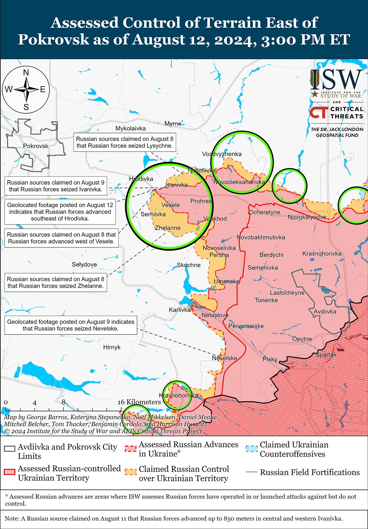 Российские войска недавно продвинулись к востоку от Покровска на фоне продолжающихся наземных атак к востоку и юго-востоку от Покровска 12 августа. На геолоцированных кадрах, опубликованных 12 августа, видно, что российские войска продвинулись к востоку от Покровска в районе Ивановки и к юго-востоку от Гродовки. [45] 12 августа Минобороны РФ и российские военные блогеры заявили, что российские войска продвинулись на севере Карловки и захватили Лисичное (оба к востоку от Покровска). [46] Представитель украинской бригады, действующей на Покровском направлении, заявил 12 августа, что с начала вторжения Украины в Курскую область 6 августа украинские войска на передовой не наблюдают снижения активности россиян на этом направлении. [47] Пресс-секретарь сообщил, что российские войска не отвели сколько-нибудь значительных сил с этого направления, но отметил, что российские войска, по-видимому, ограничили использование беспилотников и бронетехники в этом районе. По его словам, российские войска атакуют небольшими группами по два-три человека через лесные массивы, и что такая тактика затрудняет украинским силам отслеживание групп. 11 и 12 августа враг продолжил наступательные действия к востоку от Покровска в районах населенных пунктов Воздвиженка, Новоалександровка, Калиново, Елизаветовка и Гродовка и к юго-востоку от Покровска в районах населенных пунктов Скучное, Новогродовка, Желанное, Орловка, Николаевка и Карловка. [48]