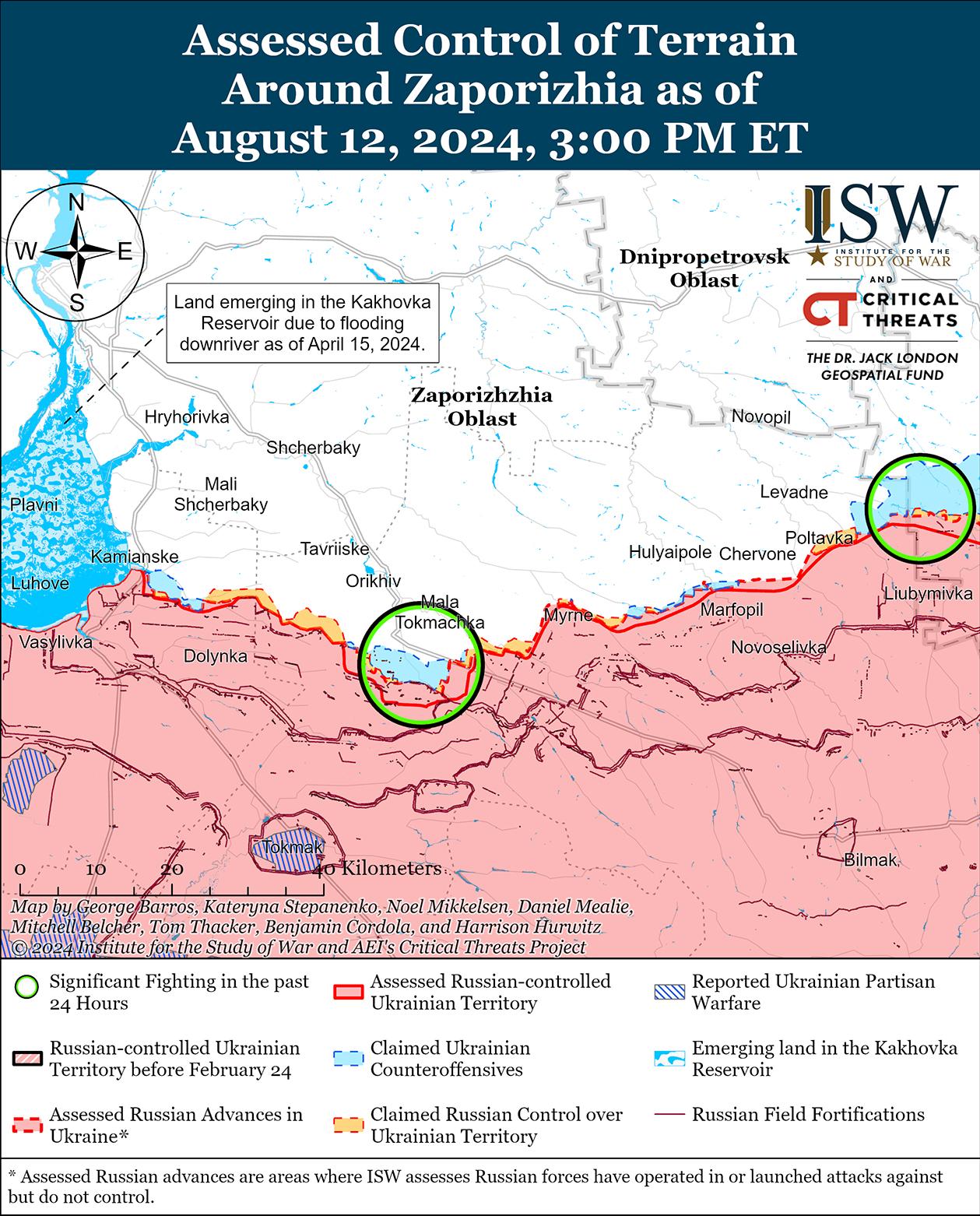 11 и 12 августа бои продолжались на западе Запорожской области в районах населенных пунктов Работино, Новоданиловка (севернее Работино), Малая Токмачка (северо-восток от Работино), Вербовое (восточнее Работино) и Гуляйполе, но подтвержденных изменений на линии фронта не было. [52] Сообщается, что части российской 22-й бригады спецназа (Главное управление Генерального штаба России [ГРУ]) продолжают действовать на Запорожском направлении. [53]