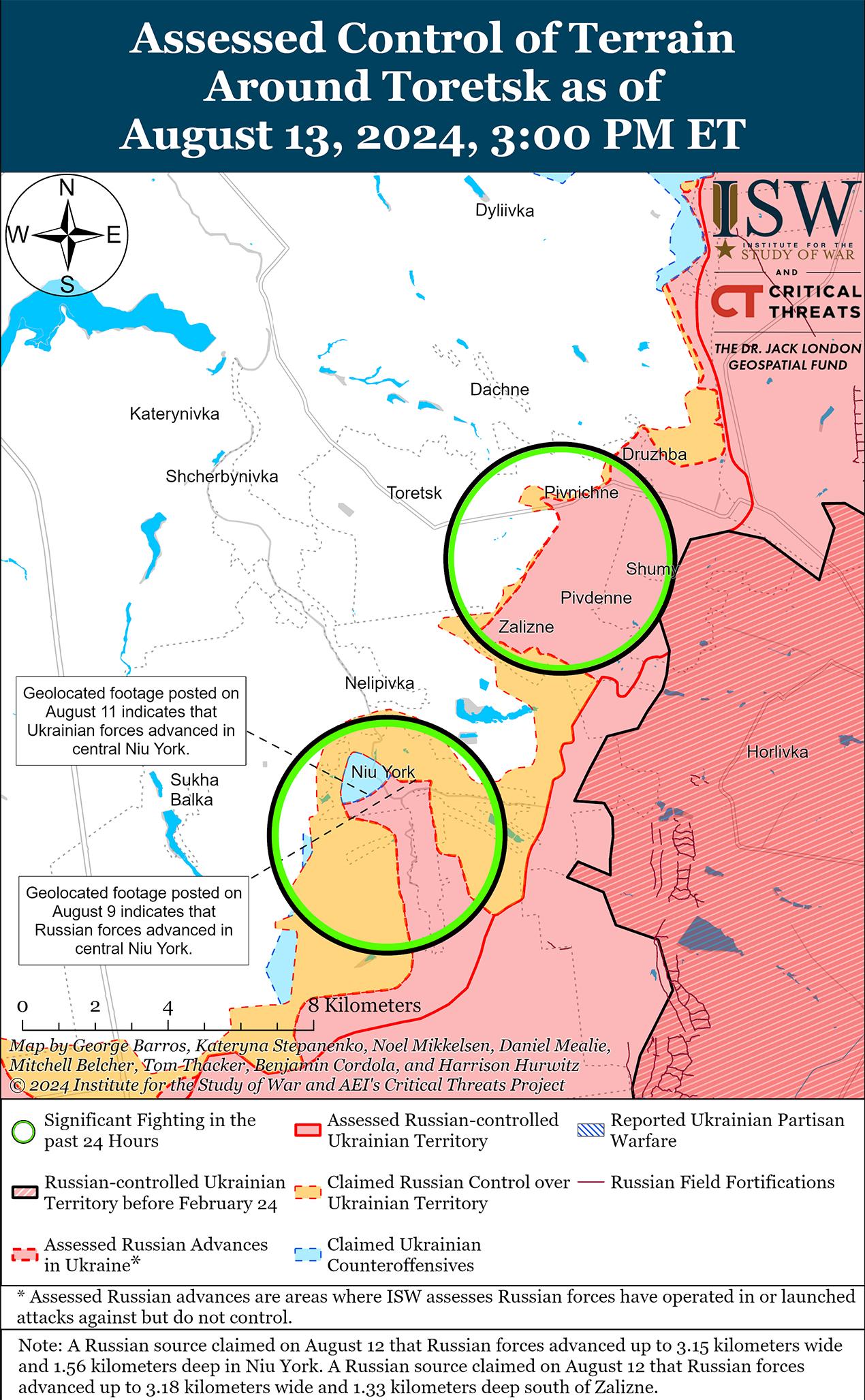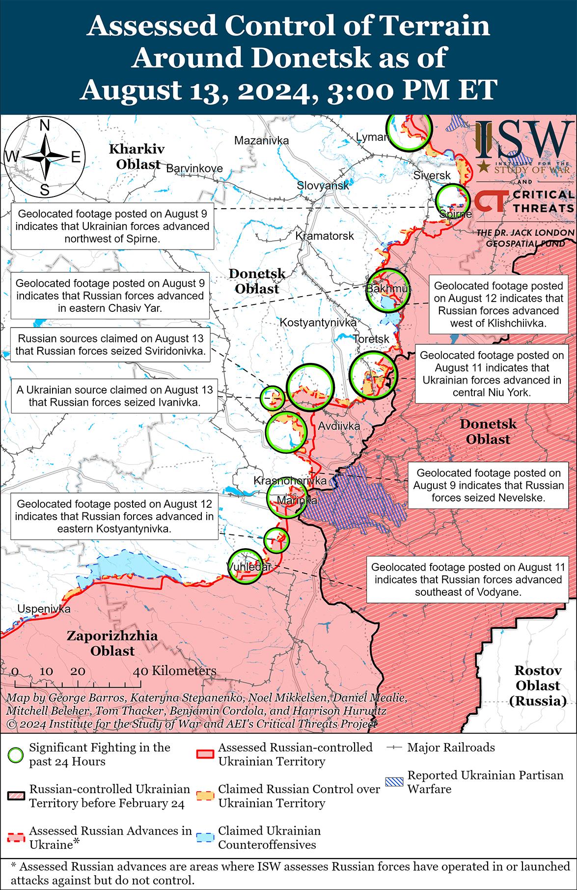 В последнее время российские войска продвинулись к юго-западу от Донецка. Геолоцированные кадры, опубликованные 12 августа, указывают на то, что российские войска в последнее время продвинулись в восточной части Константиновки (к юго-западу от Донецка). [64] На дополнительных геолоцированных кадрах, опубликованных 13 августа, видно, как украинские войска отбивают российскую механизированную атаку в составе взвода к югу от Константиновки. [65] Российский военный блогер утверждал, что ожесточенные бои идут к югу от Водяного (к юго-западу от Донецка) в районе неустановленного участка трассы Т-0524 Константиновка – Угледар. [66] Российские войска вели наступательные действия в районе Калиново (к северо-востоку от Донецка); вблизи Красногоровки и Георгиевки (оба к западу от Донецка); 12 и 13 августа в районах населенных пунктов Победа, Константиновка, Парасковиевка и Водяное (все к юго-западу от Донецка). [67] Сообщается, что операторы беспилотников российского отряда «Кайра» (39-я мотострелковая бригада, 68-я АК Восточного военного округа) действуют вблизи Константиновки. [68]
