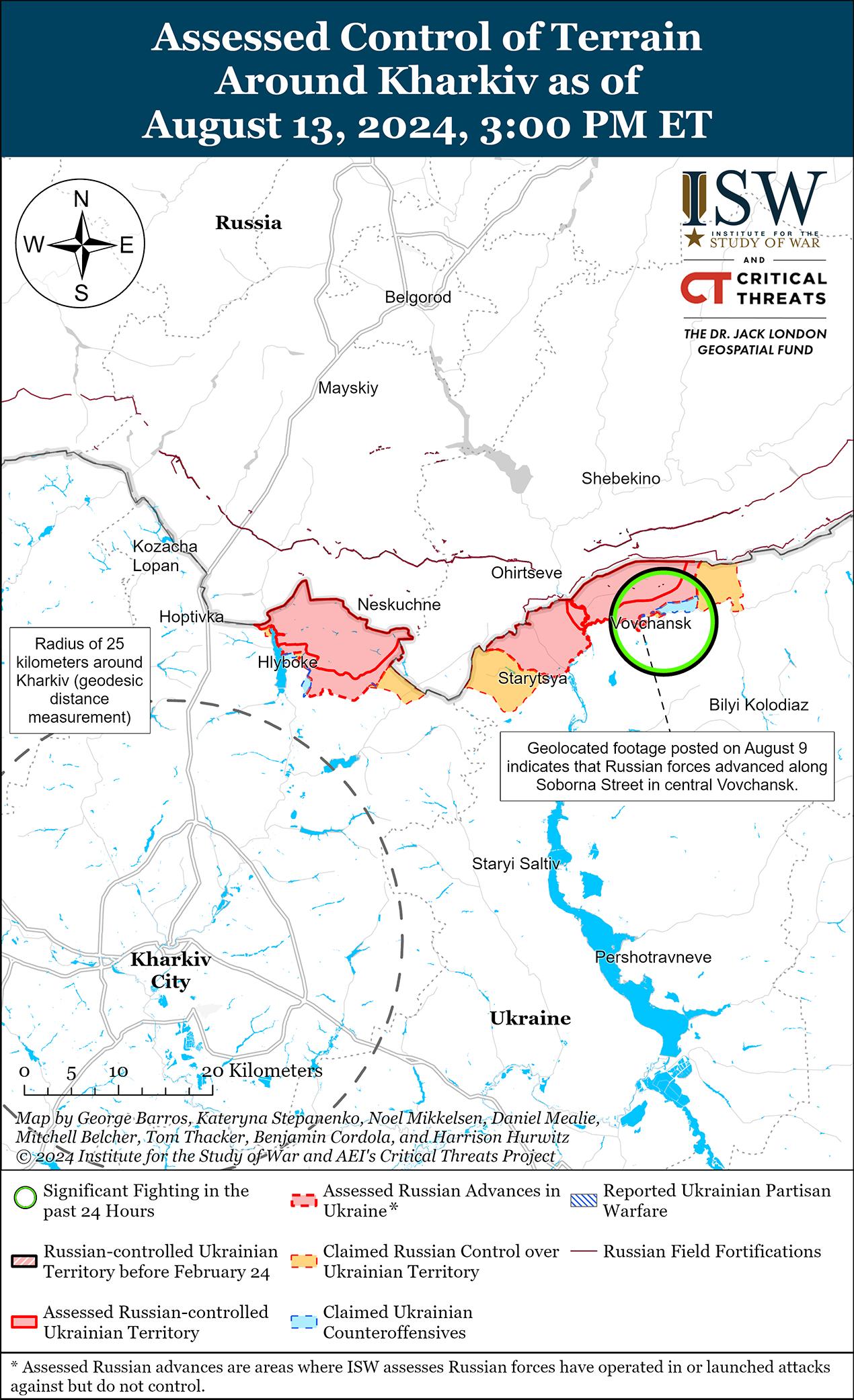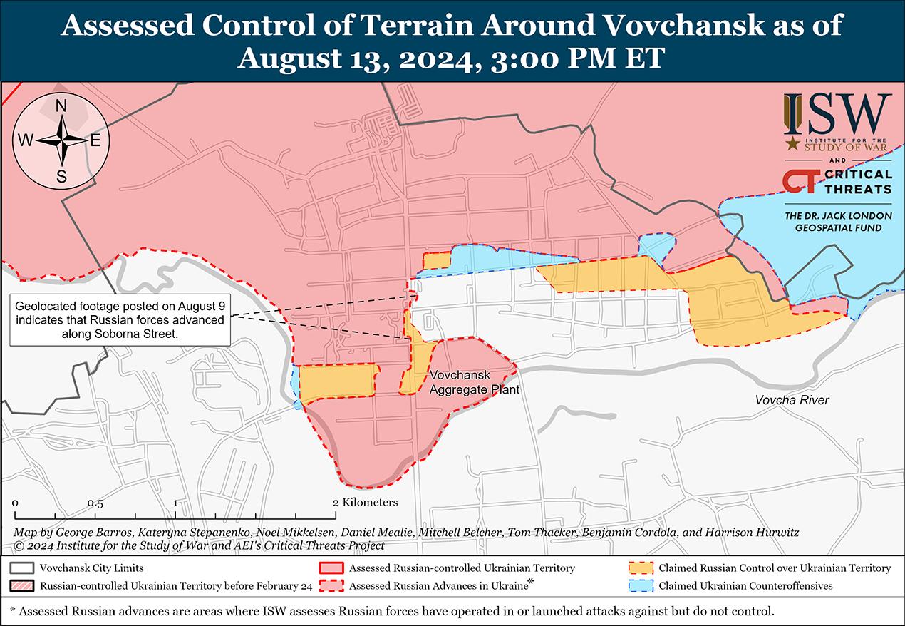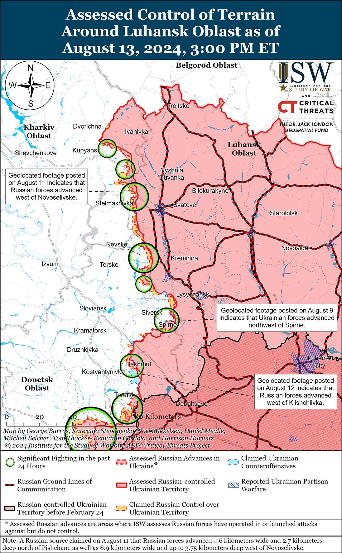 Российские военные блогеры утверждают, что украинские войска продолжают наступление в Курской области на фоне попыток России стабилизировать линию фронта в этом районе. Российские военные блогеры утверждают, что российские войска не смогли полностью стабилизировать ситуацию в Курской области, несмотря на продолжающиеся усилия по стабилизации линии фронта и отражению украинских атак. [6] Российский военный блогер утверждал, что украинские войска продвинулись в полях к северу от Снагоста (к югу от Коренево), а геолоцированные кадры, опубликованные 13 августа, указывают на то, что украинские войска недавно продвинулись к северо-востоку от Коренево. [7] Министерство обороны России и другие российские источники утверждали, что российские войска отразили украинские атаки в районе Общего Колодезя (к северо-востоку от Коренево и в 30 км от международной границы) и Алексеевского (к северо-западу от Коренево и в 27 км от международной границы), а геолоцированные кадры, опубликованные 13 августа, указывают на то, что украинские войска продвинулись к северо-востоку от Алексеевского. [8] Российские военные блогеры утверждают, что украинские войска продолжают наступление на Коренево и Толпино (к северу от Коренево). [9] Российские военные блогеры также утверждали, что украинские войска захватили Погребки (к северу от Суджи и в 17 км от международной границы). [10] Российский военный блогер заявил, что украинские войска пытались закрепиться в районе Большого Солдатского (к северо-востоку от Суджи и в 27 км от международной границы). [11] На геолоцированных кадрах, опубликованных 12 августа, видны действия украинских войск в восточной части Плехово (к югу от Суджи), а российские военные блогеры утверждали, что по состоянию на вечер 12 августа в населенном пункте продолжались бои, хотя позже военный блогер заявил, что российские войска отбросили украинские войска от населенного пункта 13 августа. [12] Геолоцированные кадры, опубликованные 12 августа, указывают на то, что украинские войска продвинулись к востоку от Гири (к юго-западу от Суджи), хотя ISW не может подтвердить украинское присутствие в Гири в настоящее время. [13] Однако российские военные блогеры утверждали, что российские войска отразили украинскую атаку в Гири. [14] Опубликованные 12 и 13 августа геолоцированные кадры, на которых видно, как украинские войска действуют в максималистском заявленном пределе украинского наступления, указывают на то, что украинские войска продолжают действовать ближе к международной границе в Курской области и в Судже. [15] Российские военные блогеры заявили 13 августа, что российские войска продолжают отражать попытки украинцев пересечь пограничный пункт пропуска «Колотиловка» в Белгородской области (на международной границе к юго-востоку от Суджи и к северо-западу от Белгорода). [16]