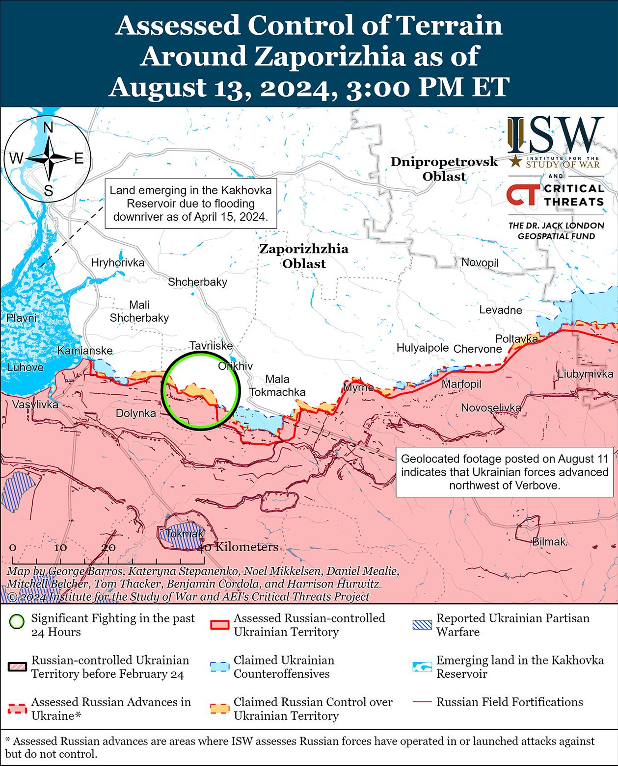 Украинские войска недавно добились незначительных успехов на западе Запорожской области на фоне продолжающихся боев 13 августа. На геолоцированных кадрах, опубликованных 11 августа, видно, что украинские войска незначительно продвинулись к северо-западу от Вербовое (к востоку от Работино). [70] По данным Генштаба Украины, 12 и 13 августа продолжались бои в районе Новоандреевки (к северу от Работино). [71] Сообщается, что на Ореховском направлении действуют подразделения 3-го батальона 247-го воздушно-десантного полка (7-й дивизии ВДВ) ВДВ. [72]