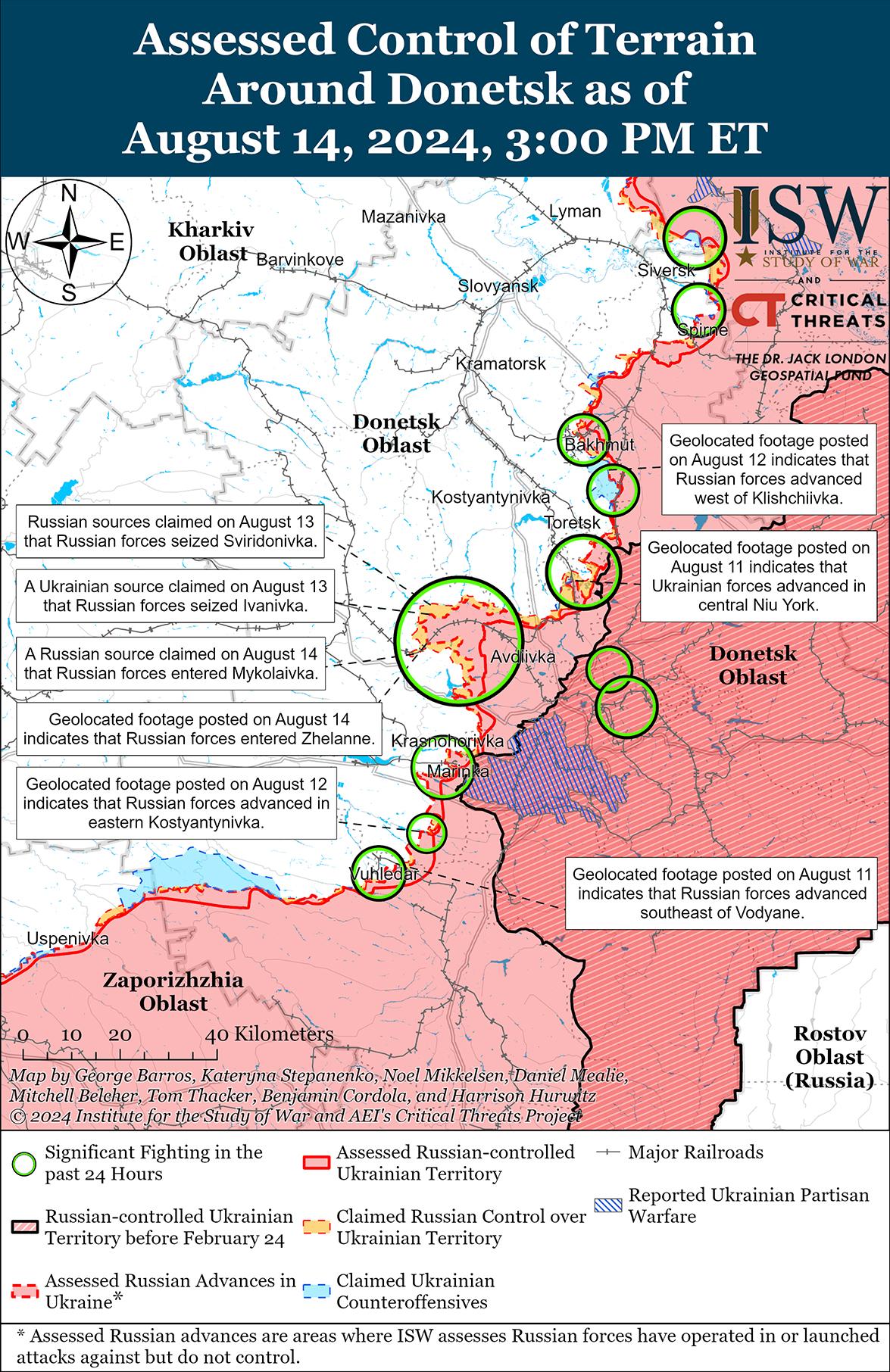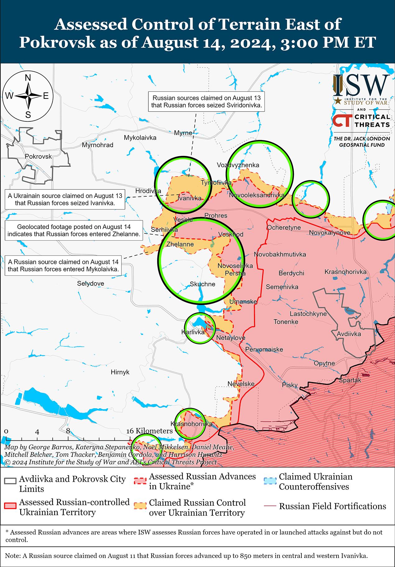 В последнее время российские войска зафиксировали успехи на Покровском направлении на фоне продолжающихся боев 14 августа. На геолоцированных кадрах, опубликованных 13 и 14 августа, видно, что российские войска продвинулись в полях к северу от Новоселовки Первой и в северо-западном Желанном (оба к юго-востоку от Покровска) соответственно. [50] Российский военный блогер утверждал, что российские войска также продвинулись на полях к западу от Свиридоновки и к востоку от Гродовки и Орловки (все к востоку от Покровска) и вошли в Николаевку (к юго-востоку от Покровска и к юго-западу от Желанного), однако ISW не обнаружил подтверждения этих заявлений. [51] Российские войска также продолжили наземные атаки к северо-востоку от Покровска в районе Малиновки; восточнее Покровска в районе Воздвиженки, Новоалександровки, Зеленого Поля и Елизаветовки; и юго-восточнее Покровска в районе Калиново, Водяного, Скучного, Карловки, Птичье 13 и 14 августа. [52]