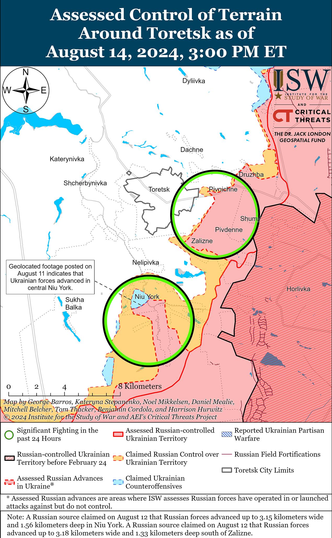 Российские военные блогеры утверждают, что украинские войска незначительно продвинулись в Курской области на фоне в целом более медленных темпов украинских операций, поскольку российские войска продолжают попытки стабилизировать линию фронта в этом районе. Украинское издание «Суспільне» сообщило 14 августа, что его источники в украинских вооруженных силах заявили, что темпы украинского продвижения в Курской области замедлились из-за растущего сопротивления россиян в направлении Курска. [1] Российские военные блогеры утверждают, что российские войска постепенно стабилизируют линию фронта в Курской области, а также что неустановленные российские подкрепления прибывают из неуказанных районов и налаживают связь с российскими подразделениями, уже находящимися в этом районе. [2] Российские военные блогеры утверждали, что украинские войска продвинулись в Краснооктябрьское (к юго-западу от Коренево и в 15 км от международной границы). [3] На геолоцированных кадрах, опубликованных 13 августа, видны действия украинских сил в восточной части Журавли (к западу от Коренево и в 20 км от международной границы), что указывает на продвижение украинских сил в восточной части населенного пункта. [4] Министерство обороны России и другие российские источники утверждали, что российские войска отразили украинские атаки вблизи Скрылевки, Левшинки, Семеновки и Алексеевского (все к северо-востоку от Коренево в районе Каучука, который находится в 27 км от международной границы). [5] Командир чеченского спецназа «Ахмат» Апты Алаудинов заявил, что украинские войска не контролируют Суджу, хотя несколько других российских источников утверждали, что бои в Судже и вокруг нее продолжаются и что ни одна из сторон полностью не контролирует населенный пункт. [6] Опубликованные 14 августа геолоцированные кадры, на которых украинский журналист ведет репортаж из центра Суджи, указывают на то, что украинские силовики контролируют по крайней мере часть населенного пункта и некоторые его окрестности. [7] Источники «Суспільного» в украинской армии заявили, что украинские войска продвинулись за Мартыновку (к северо-востоку от Суджи), хотя российские военные блогеры утверждали, что бои в населенном пункте все еще продолжаются. [8] Известный российский военный блогер, связанный с Кремлем, заявил, что Михайловка (также к северо-востоку от Суджи) остается под контролем Украины, подразумевая, что украинские войска захватили Михайловку в неустановленную предыдущую дату. [9] Опубликованные 14 августа геолоцированные кадры, на которых украинские войска действуют к северо-западу от Уланка (к юго-востоку от Суджи), указывают на то, что украинские войска недавно продвинулись в этом районе. [10] Дополнительные геолоцированные кадры, опубликованные 14 августа, указывают на то, что украинские войска в последнее время незначительно продвинулись в западной части Камышного (к юго-востоку от Суджи). [11] На геолоцированных кадрах, опубликованных 13 августа, видно, как российский журналист ведет репортаж из Гири и Озерки (оба к юго-востоку от Суджи и к востоку от Камышного), хотя российские источники позже заявили 14 августа, что украинские войска начали действовать в районе Гири и Белицы (к северу от Гири), предполагая, что украинские войска могут оспаривать район к востоку от Камышного. [12]