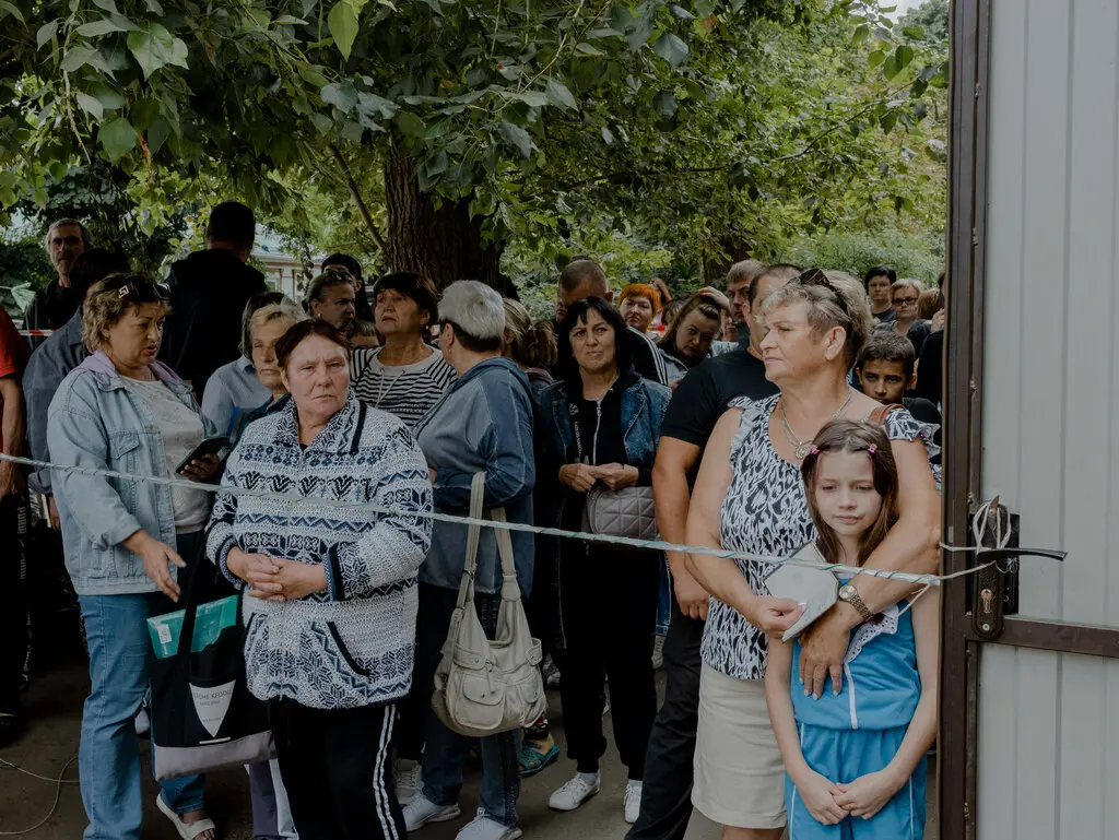 Российские эвакуированные из приграничных районов, в том числе из Суджи, ожидают раздачи гуманитарной помощи в городе Курск во вторник. Фото…Нанна Хайтманн для The New York Times