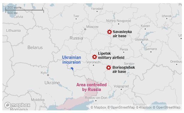 Спутниковые снимки, проверенные The New York Times, показали, что российские авиабазы в Саваслейке и Борисоглебске, примерно в 400 и 150 милях от границы, получили повреждения, в том числе два ангара, которые были разрушены, и склад, который получил повреждения.