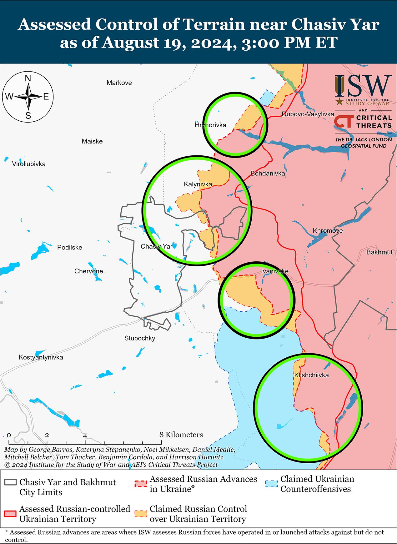 Сообщается, что 19 августа российские войска продвинулись в Часовом Яру, хотя подтвержденных изменений на линии фронта не было. Российский военный блогер заявил, что российские войска захватили и зачистили украинское укрепление к востоку от Жовтневого микрорайона в восточной части Часова Яра, хотя ISW пока не обнаружил визуальных доказательств этого заявления. [45] В Генштабе сообщили, что бои продолжаются к северо-востоку от Часова Яра в районе Григорьевки и Калиновки; восточнее Часова Яра в районе Ивановского; к юго-востоку от Часова Яра в районе Андреевки и Клещеевки; и южнее Часова Яра в районе Предтечное и Ступочки. [46] Сообщается, что части 98-й воздушно-десантной дивизии (ВДВ) действуют в районе канала Северский-Донец на Донбассе в восточной части Часова Яра. [47]