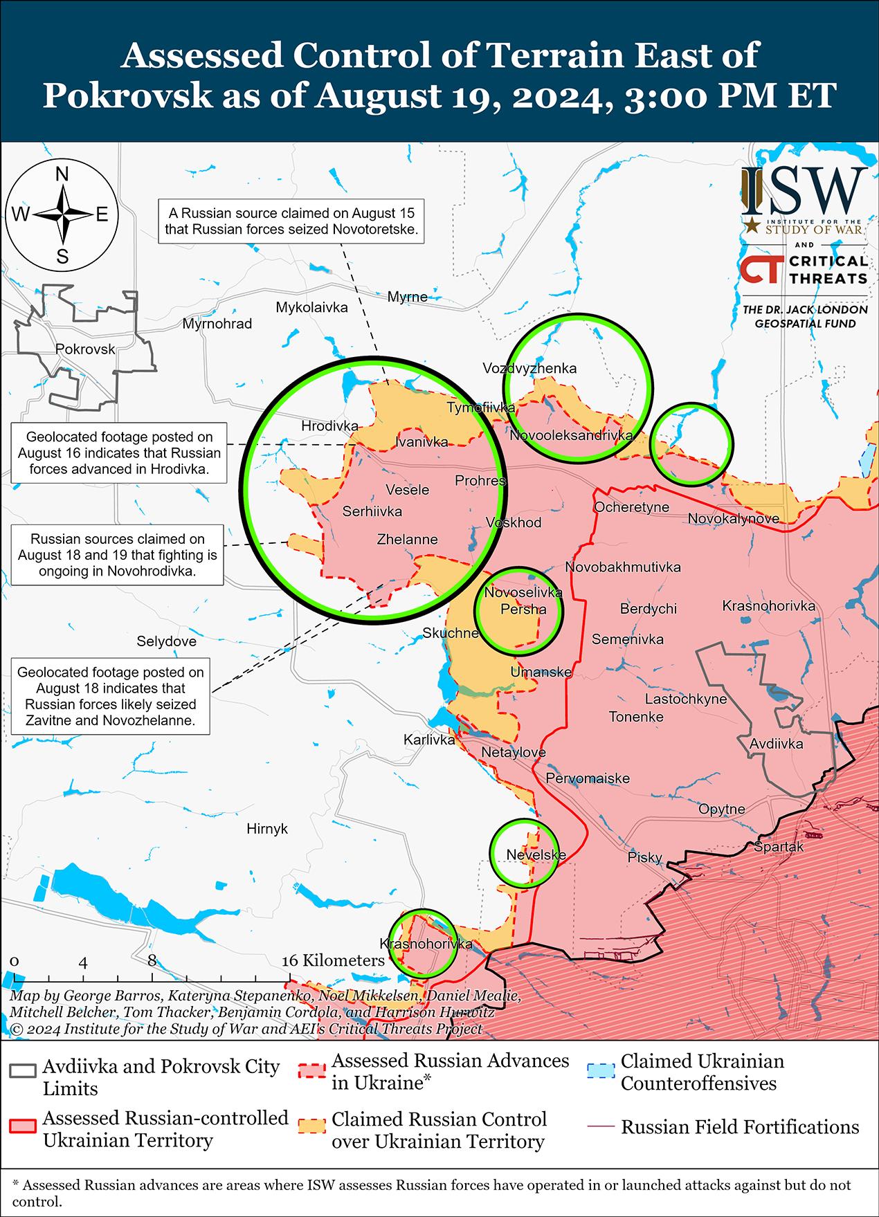 В последнее время российские войска продвинулись к юго-востоку от Покровска и 19 августа продолжили наступательные действия в направлении Покровска. Опубликованные 18 августа геолоцированные кадры с российским флагом в южной части Завитного (к юго-востоку от Покровска) указывают на то, что российские войска недавно захватили Завитное и Новожеланное (к северу от Завитного). [53] Российские военные блогеры сообщали, что российские войска продвигаются в направлении Камышовки и Птичного (к юго-востоку от Покровска и к юго-востоку от района Новожеланное–Комышевка) и что украинские войска отходят из этих населенных пунктов, чтобы избежать тактического окружения. [54] Некоторые российские военные блогеры также утверждали, что российские войска вышли на окраины Гродовки и Новогродовки (к востоку и юго-востоку от Покровска соответственно), но ISW не зафиксировал визуальных подтверждений присутствия российских войск ни в одном из этих населенных пунктов. [55] По данным Генштаба Украины, российские войска атаковали к северо-востоку от Покровска в районе Воздвиженки, Зеленого Поля, Калиново и Миролюбовки и к юго-востоку от Покровска в районе Николаевки, Птичного, Новогродовки, Завитного и Скучного. [56]