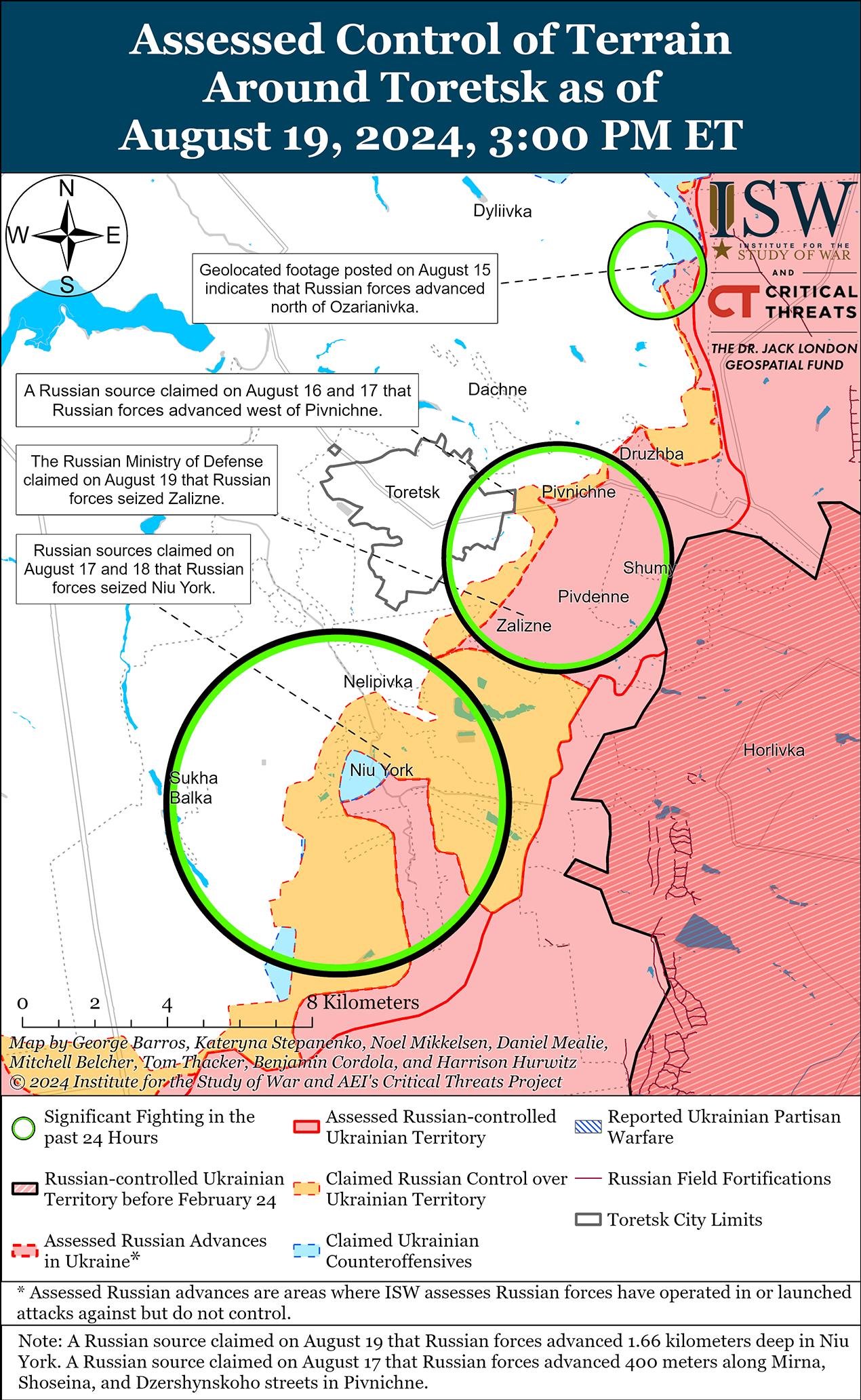 Сообщается, что 19 августа российские войска продолжили наступление на Торецком направлении. 19 августа Министерство обороны России заявило, что элементы российской Центральной группировки войск захватили Железное (к юго-востоку от Торецка), а известный военный блогер заявил, что российские войска также продвинулись через электрическую подстанцию к западу от Железного и продвигаются в направлении Нелиповки (к юго-западу от Железнодорожного и к югу от Торецка). [48] Несколько российских военных блогеров также утверждали, что российские войска захватили весь Нью-Йорк (к югу от Торецка) и зачищают позиции в северной части населенного пункта, чтобы атаковать на север в направлении Нелиповки, поддерживая усилия по продвижению к Нелиповке из западного Железного. [49] Некоторые российские военные блогеры также утверждали, что российские войска продвинулись в южную Нелиповку и укрепляют новые позиции в населенном пункте. [50] Однако ISW пока не обнаружил визуального подтверждения ни одного из этих российских заявлений, и до сих пор не располагает визуальными доказательствами, подтверждающими, что российские войска контролируют весь Нью-Йорк. В украинском Генштабе заявили, что российские войска атаковали вблизи Нелиповки, что может свидетельствовать о том, что российские войска продвинулись ближе к Нелиповке либо через Нью-Йорк, либо через Железное. [51] Украинский Генштаб также сообщал о боях под самим Торецком, а также под Нью-Йорком, Железным и Нелиповкой. [52]