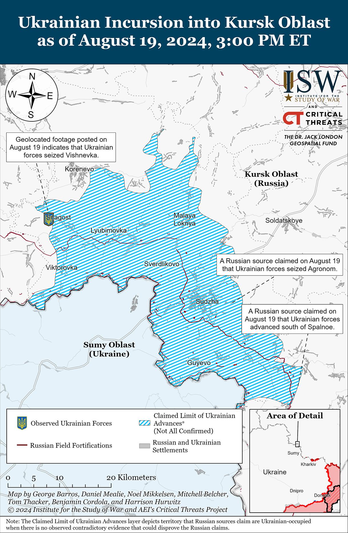 19 августа украинские войска продолжили незначительное продвижение в Курской области на фоне продолжающихся боев по всему Украинскому выступу в этом районе. Геолоцированные кадры, опубликованные 19 августа, указывают на то, что украинские войска продвинулись в Вишневке (к юго-западу от Коренево и в 14 км от международной границы). [1] Министерство обороны России заявило, что российская авиация и артиллерия нанесли удары по украинским силам, действующим в районе Вишневки, возможно, молчаливо признавая, что украинские войска продвинулись в этом районе. [2] Известный российский военный блогер, связанный с Кремлем, заявил, что украинские войска также продвинулись в Русском Поречном (к северо-востоку от Суджи и в 17 км от международной границы), к востоку от Агронома (к востоку от Суджи и в 15 км от международной границы) и к востоку от Спального (к юго-востоку от Суджи и в 5 км от международной границы). [3] Министерство обороны РФ утверждало, что российские войска отразили попытки украинских диверсий и разведки к югу от Скрылевки и Шептухова (оба к северо-востоку от Коренево и в 22 км от международной границы), а другие российские источники утверждали, что бои продолжались в районе Коренево, Ольговки (к востоку от Коренево), западной Суджи и Мартыновки (к северо-востоку от Суджи). [4] Российские военные блогеры также утверждали, что столкновения продолжались вдоль международной границы в районе Теткино. [5] Сообщается, что подразделения российской 810-й бригады морской пехоты (Черноморский флот [ЧФ]) действуют вблизи Ольговки; сообщается, что в Судже действуют элементы чеченской группировки спецназа «Ахмат» «Аида»; сообщается, что в Курской области действует разведывательно-ударная рота «Варяг» 155-й бригады морской пехоты (Тихоокеанский флот, Восточный военный округ [ВВО]). [6] Сообщается, что подразделения российского батальона специального минирования «Феникс», которые, как сообщается, действовали в районе Часова Яра по состоянию на конец мая 2024 года, действуют вблизи Мартыновки. [7]