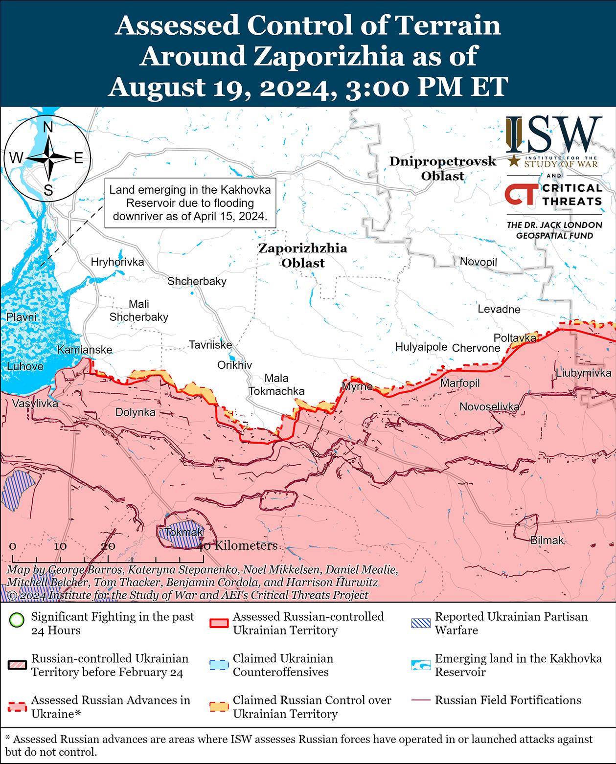 Президент Украины Владимир Зеленский 19 августа заявил, что Россия пытается запугать мир радиологическим инцидентом на оккупированной Россией Запорожской атомной электростанции (ЗАЭС), что согласуется с оценкой ISW о том, что Россия усиливает опасения по поводу радиологического инцидента, чтобы напугать Запад и отказаться от поддержки Украины. [71] Зеленский заявил, что Россия использует территорию ЗАЭС для обстрелов украинских населенных пунктов и хранит на заводе военную технику. [72] ISW много писал о том, что российские войска регулярно подвергают опасности ЗАЭС с момента оккупации ЗАЭС в марте 2022 года. [73]