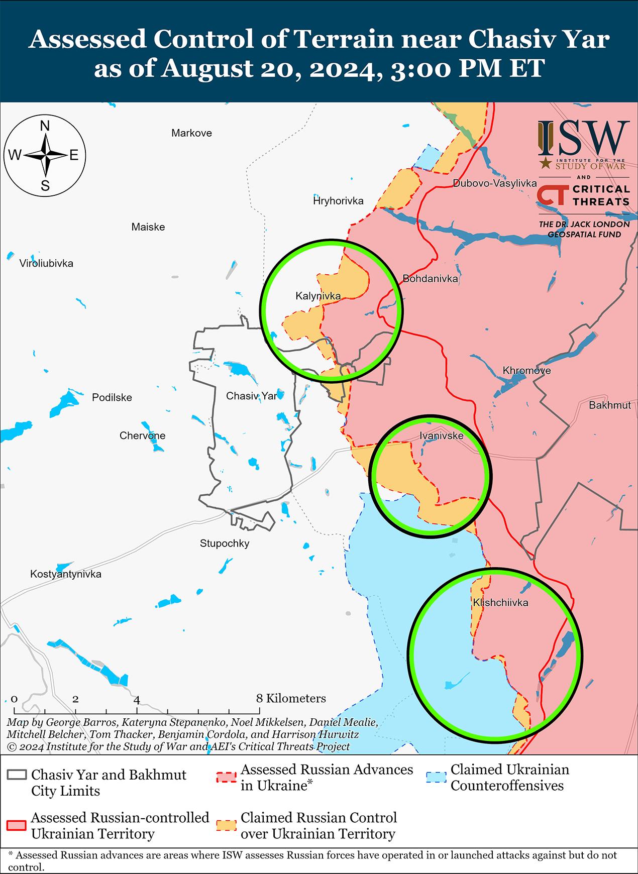 Сообщается, что российские власти передислоцировали российские подразделения с направления Часов Яр в Курскую область на фоне усилий по противодействию продолжающемуся вторжению Украины в Курскую область, когда российские войска ранее находились в этом районе и передислокации с менее приоритетных участков фронта в Украине. 20 августа российский военный блогер заявил, что подразделения российской 11-й воздушно-десантной бригады (ВДВ) нанесли удар по украинской бронемашине на юге Русской Конопелки (к востоку от Суджи), а по сообщениям, по состоянию на конец июля 2024 года подразделения российской 11-й бригады ВДВ действовали в районе Часова Яра. [25] Однако российское военное командование, вероятно, передислоцировало части 11-й бригады ВДВ, предназначенные для смены или усиления фронтовых подразделений, а не подразделений, которые участвовали в боевых действиях на передовой. Ранее в ISW отмечали, что такое развертывание может повлиять на темп российских наступательных операций, но, вероятно, потребуется несколько недель, чтобы наблюдать за возможными последствиями таких передислокаций для российских операций в Донецкой области. [26] По оценкам ISW, российское военное командование, вероятно, крайне не желает отводить российские воинские части, участвующие в боевых действиях, из более приоритетных секторов в Донецкой области из-за опасений по поводу дальнейшего замедления темпов российских операций на этих направлениях. [27]