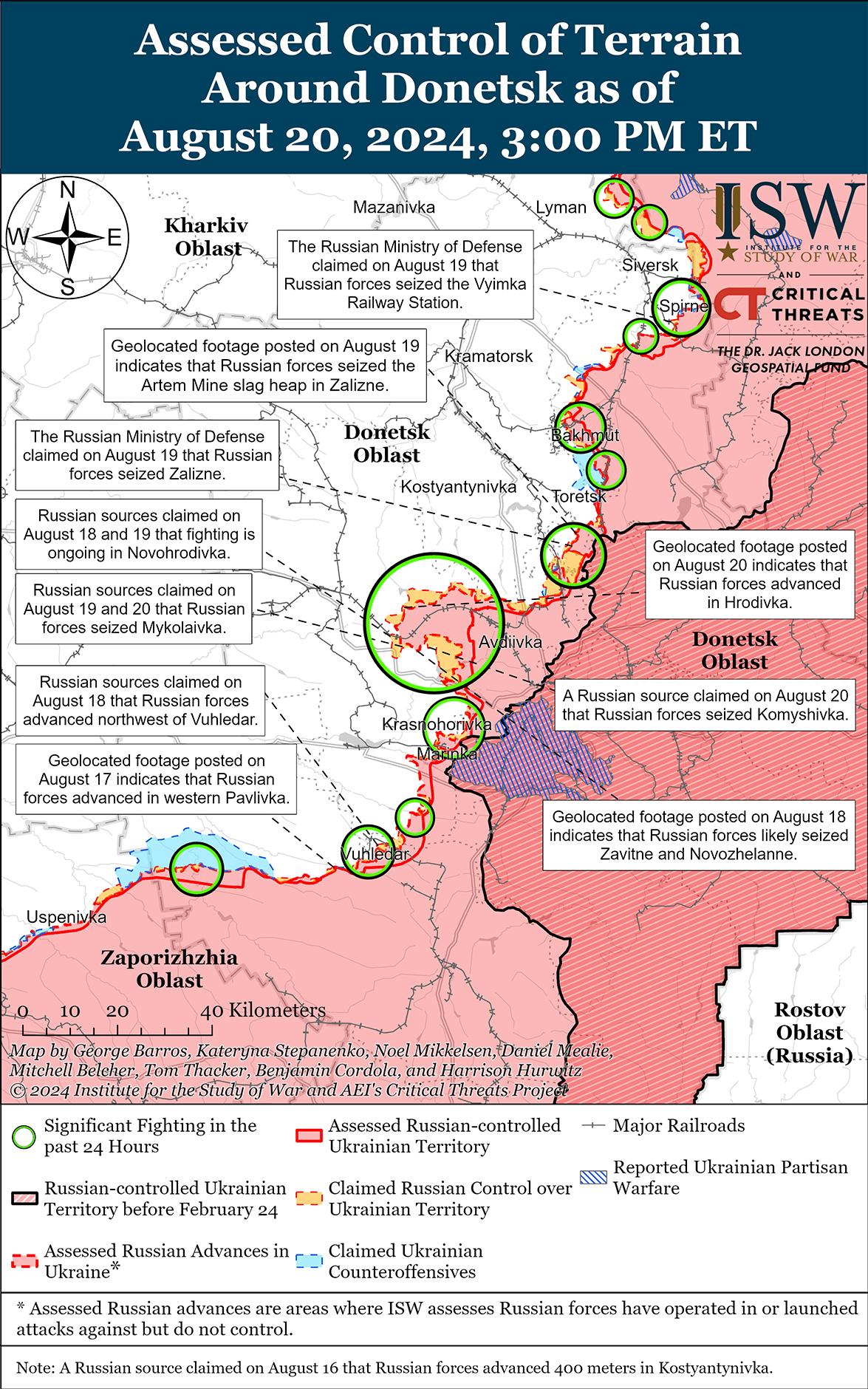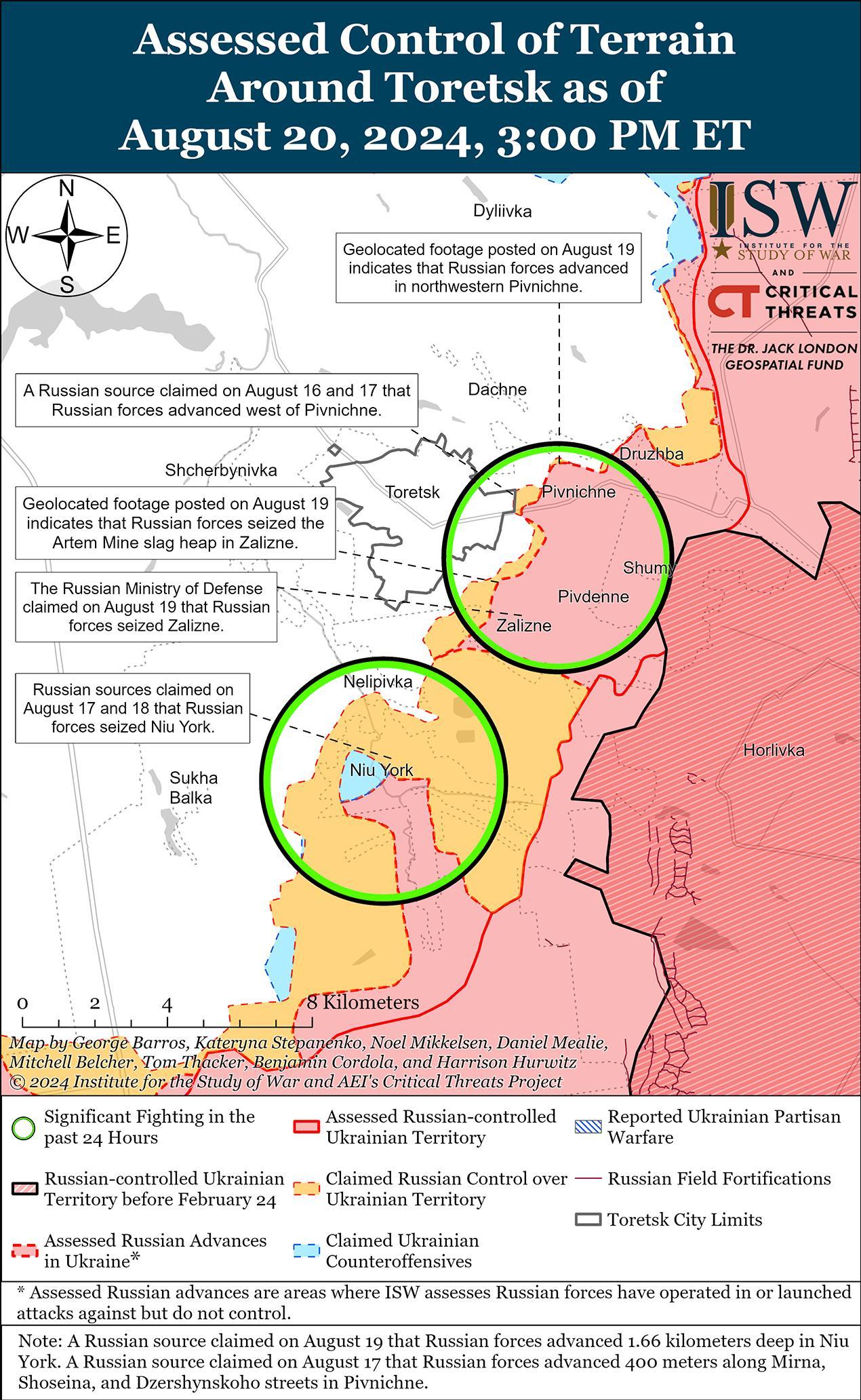 Российские войска продвинулись к востоку и юго-востоку от Торецка на фоне продолжающихся наступательных действий в этом районе 20 августа. Геолоцированные кадры, опубликованные 20 августа, свидетельствуют о том, что в последнее время российские войска продвинулись вдоль улиц Центральной и Молодежной на северо-западе и западе Северного (к востоку от Торецка). [52] На дополнительных геолоцированных кадрах, опубликованных 14 и 18 августа, видно, что в последнее время российские войска продвинулись на северо-западе и западе Железного (к востоку от Торецка) и захватили террикон шахты «Артем» (на западной окраине Железного). [53] Украинское издание «Украинская правда» сообщило, что источники в руководстве украинской бригады, действующей на Торецком направлении, заявили, что украинские войска по-прежнему «контролируют» около 20 процентов Нью-Йорка, но российские войска продвигаются в этом районе. [54] Российские военные блогеры повторяли утверждения о том, что российские войска очистили от Нью-Йорка (к югу от Торецка), полностью захватили Нью-Йорк и продвинулись в сторону Нелиповки (к северу от Нью-Йорка и к югу от Торецка), хотя ISW не зафиксировал подтверждения этих заявлений. [55] Сообщается, что в Железном действуют подразделения российской 1-й «славянской» мотострелковой бригады (1-й армейский корпус Донецкой Народной Республики [ДНР]) «Штурм». [56]