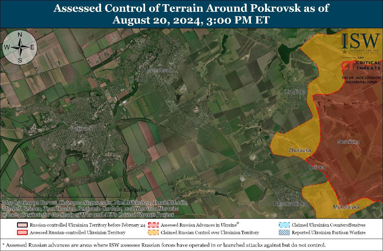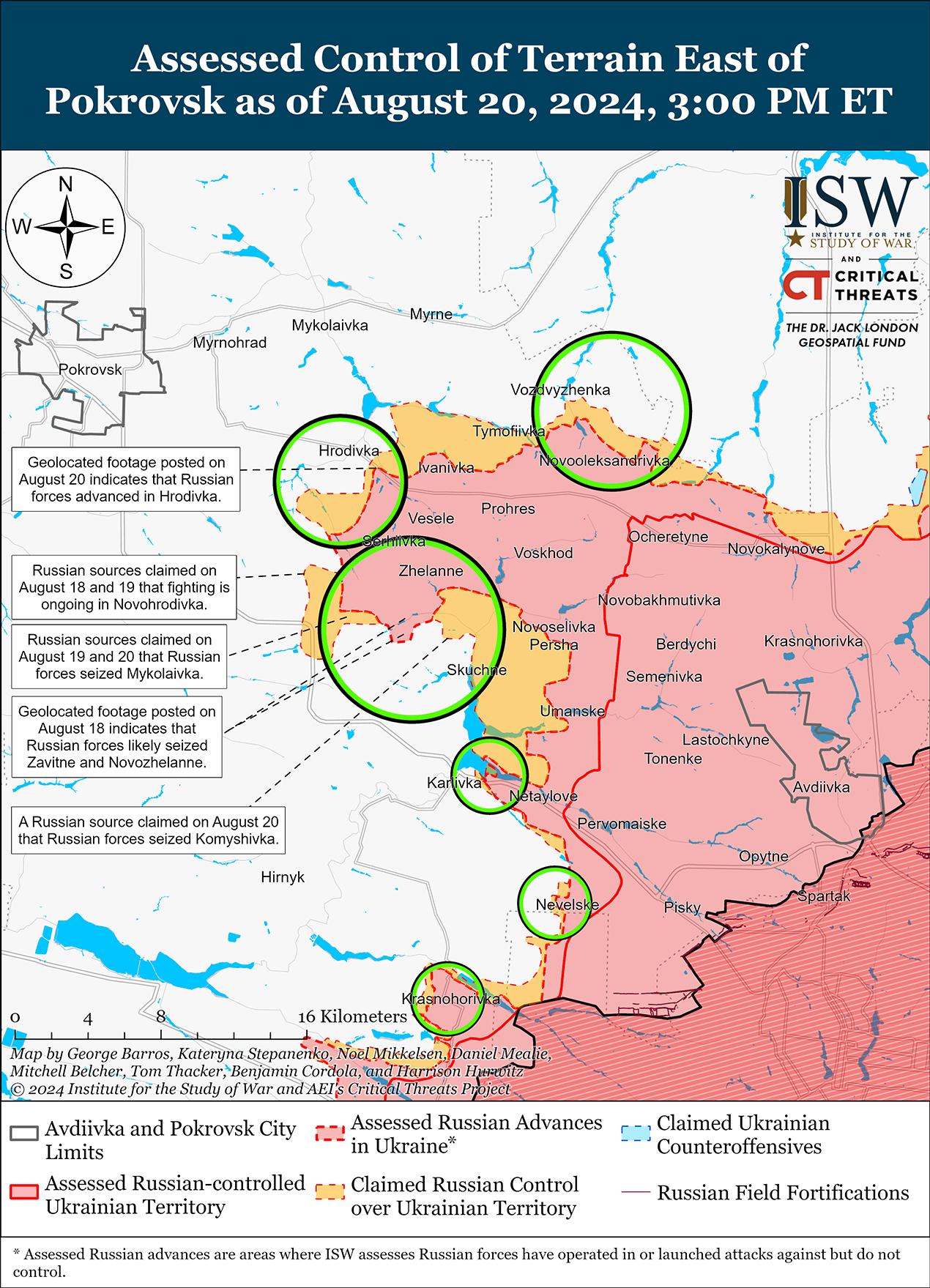 Российские войска недавно незначительно продвинулись к востоку от Покровска на фоне продолжающихся наступательных действий в этом районе 20 августа. Геолоцированные кадры, опубликованные 20 августа, указывают на то, что российские войска в последнее время продвинулись в юго-восточной части Гродовки (к востоку от Покровска). [57] Российское продвижение через Гродовку, скорее всего, замедлится, поскольку российские войска начнут вести бои в более урбанизированных районах населенного пункта, и российские войска могут с трудом поддерживать нынешние темпы наступления, пытаясь продвинуться дальше на запад к Мирнограду (к северо-востоку от Покровска) и Покровску, поскольку эти города больше и более плотно урбанизированы по сравнению с небольшими и в основном сельскими населенными пунктами, которые российские войска захватили к востоку от Покровска и к западу Авдеевки до сих пор. Темпы российского продвижения в этом районе также будут зависеть от того, насколько хорошо будут укомплектованы и оснащены украинские силы, защищающие эти города. Российские военные блогеры утверждали, что российские войска также продвинулись к юго-востоку от Покровска в районе Мариновки, Николаевки и Камышовки и в направлении Новогродовки, но в ISW не зафиксировали визуального подтверждения этих заявлений. [58] 19 и 20 августа российские войска продолжили наступательные действия к востоку от Покровска в районе Воздвиженки и Михайловки, а также в направлении Зеленого Поля и к юго-востоку от Покровска в районе Калиновки, Птичье и Скучного. [59] Сообщается, что подразделения российской бригады «Волга» действуют вблизи Новогродовки. [60]