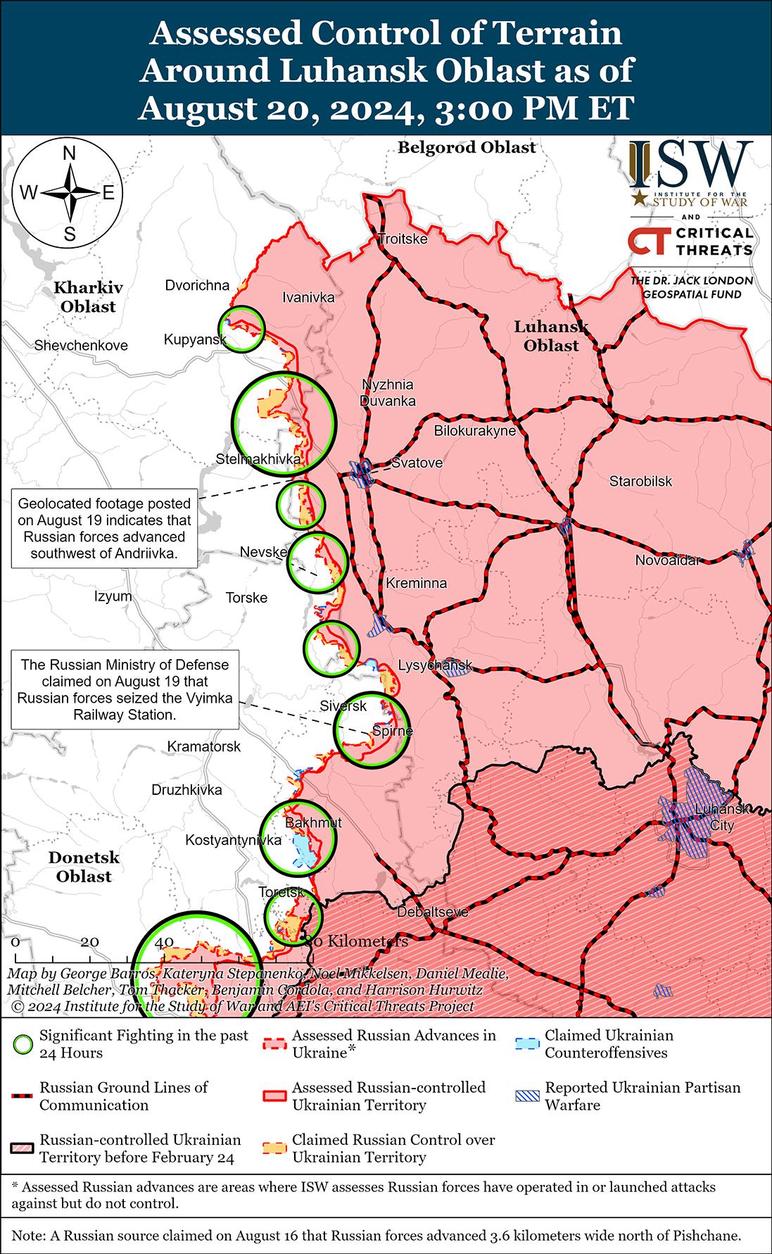 20 августа российские войска продолжили наземные атаки на линии Купянск – Сватово – Кременная, но подтвержденных изменений на линии фронта не было. Российский военный блогер заявил, что российские войска форсировали реку Жеребец и закрепились в направлении Грековки (к северо-западу от Кременной). [45] ISW не обнаружил визуальных доказательств этого утверждения, но считает, что российские войска продвинулись за реку Жеребец на севере Макеевки (к северо-западу от Кременной и к востоку от Грековки). Другой российский военный блогер заявил, что российские войска медленно продвигаются к Колесниковке (к юго-востоку от Купянска). [46] Бои продолжались к северо-востоку от Купянска в районе Синьковки; восточнее Купянска в районе Петропавловки; к юго-востоку от Купянска в районах населенных пунктов Глушковка, Стельмаховка, Крутяковка и в направлениях Новоосыново и Лозовая; к западу от Сватово в районе Андреевки; к юго-западу от Сватово в районе Новоегоровки и Новосергиевки; к северо-западу от Кременной в районах населенных пунктов Макеевка, Невское, Новосадово и Грековка; к западу от Кременной у Торского; к югу от Кременной в Серебрянском лесничестве; и юго-западнее Кременной в районе Дибровы 19 и 20 августа. [47]