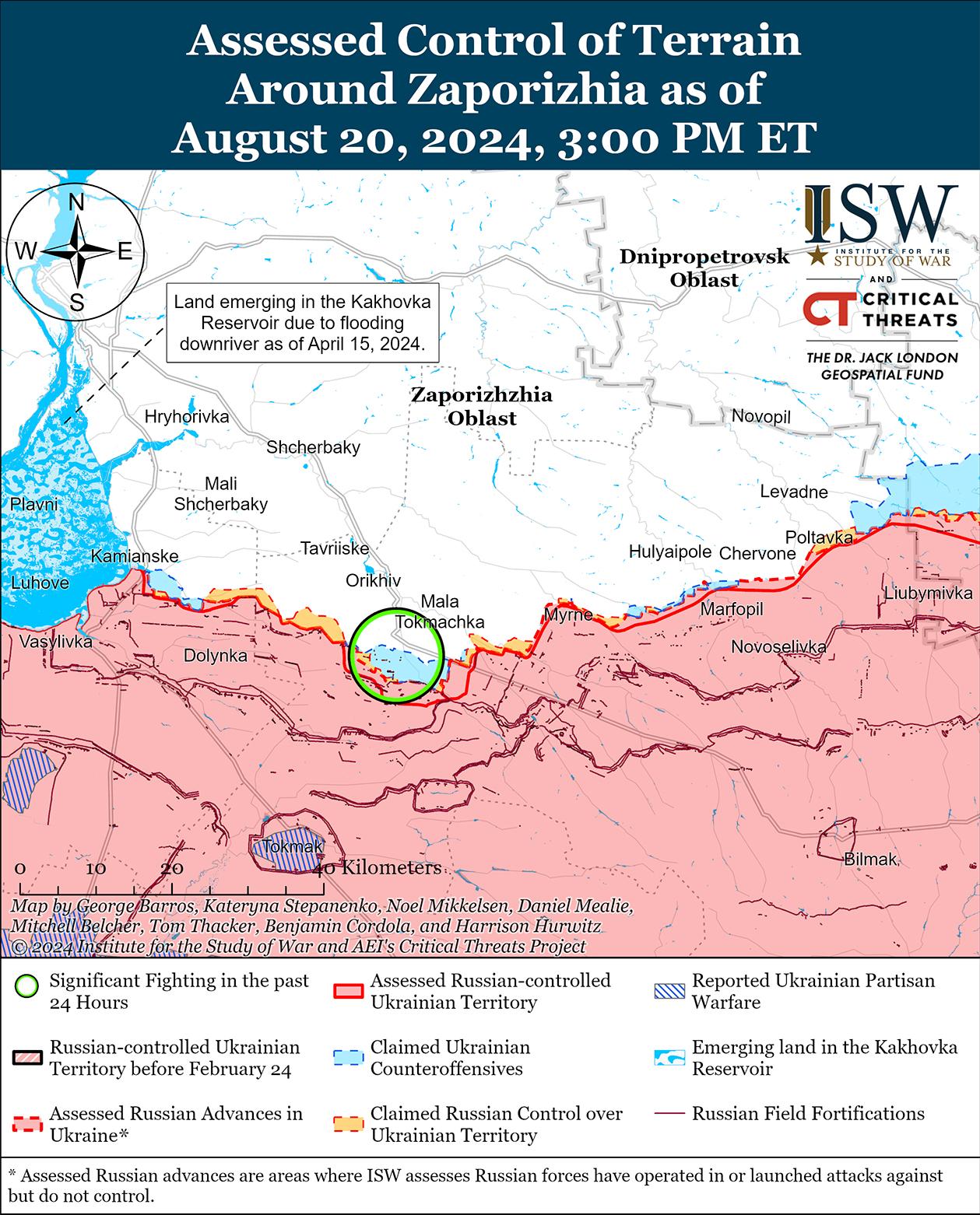 Главнокомандующий войсками Украины генерал-полковник Александр Сырский 20 августа продемонстрировал карту, изображающую ситуацию в Курской области 20 августа, и ISW будет использовать границы этой карты для обновления своей оценки максималистских заявленных пределов украинских наступлений в Курской области, соответствующих методологии картографирования ISW для украинского вторжения на данный момент.