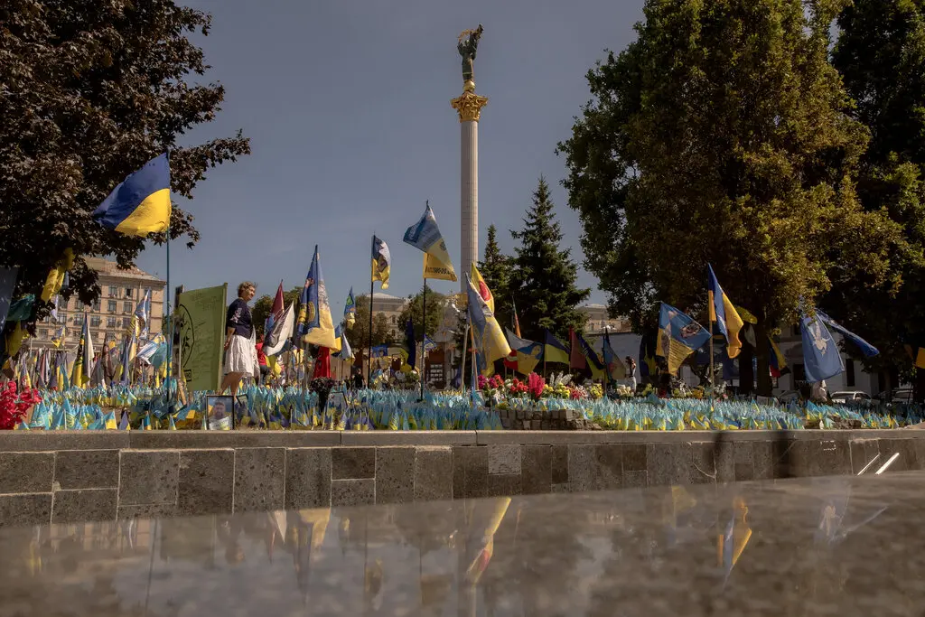 Посетители площади Независимости в Киеве в память о погибших бойцах во время празднования Дня независимости Украины в субботу. Фото…Роман Пилипеи/Agence France-Presse — Getty Images