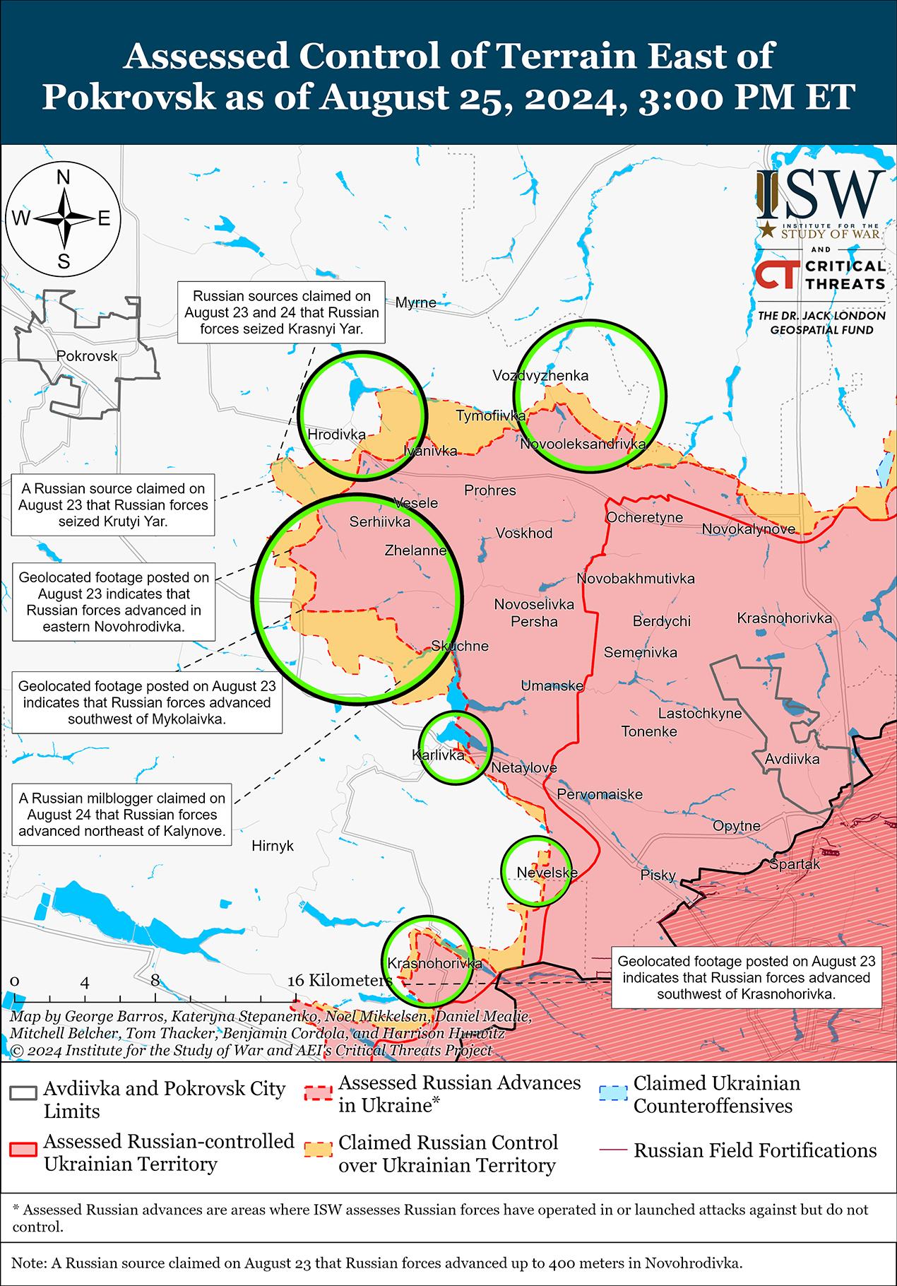 Сообщается, что 25 августа российские войска продолжили наступление к юго-востоку от Покровска, но подтвержденных изменений на линии фронта под Покровском не произошло. Российские военные блогеры утверждают, что российские войска продвинулись дальше в южной и восточной части Новогродовки (к юго-востоку от Покровска) и что российские войска контролируют половину населенного пункта. [46] Российские военные блогеры утверждали, что российские войска продвинулись к окраинам Мариновки (непосредственно к югу от Новогродовки), продвинулись до 5,45 км по фронту и на 1,7 км вглубь к северу от Калиново (к юго-востоку от Покровска) и продвинулись вдоль Карловского водохранилища к востоку от Калиново. [47] Однако ISW не обнаружил подтверждения этих российских заявлений. 24 и 25 августа враг продолжил наступательные действия к востоку от Покровска в районах населенных пунктов Воздвиженка, Зеленое Поле, Миролюбовка, Гродовка, Крутой Яр и Красный Яр и к юго-востоку от Покровска в районах населенных пунктов Калиновое, Новогродовка, Мариновка, Птичье и Карловка. [48]