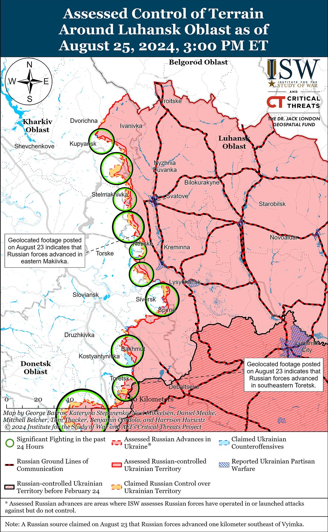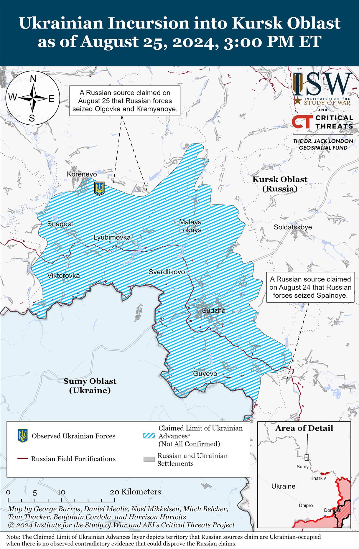 Российские военные блогеры утверждают, что российские войска недавно вернули утраченные позиции в Курской области на фоне сообщений о продолжающихся украинских атаках в этом районе 25 августа. 25 августа российский военный блогер заявил, что российские войска вернули утраченные позиции в Комаровке (к юго-западу от Коренево) и отбивают небольшие украинские атаки в этом районе. [1] 25 августа несколько российских военных блогеров заявили, что российские войска отбили Ольговку и Кремяное (оба к востоку от Коренево) и что российские войска продвигаются к западу от Кремяного. [2] Другой российский военный блогер заявил, что украинские войска все еще контролируют Кремяное. [3] Несколько российских военных блогеров утверждали, что украинские войска окружили подразделения российской 18-й мотострелковой дивизии (11-й армейский корпус [АК], Ленинградский военный округ [ЛВО]) в Малой Локне (к северу от Суджи) и что подразделения либо 810-й бригады морской пехоты (Черноморский флот [ЧФ]), либо 1427-го мотострелкового полка (территориальные войска) прорвали украинское окружение и позволили личному составу 18-й мотострелковой дивизии отступить. [4] Российские военные блогеры утверждают, что бои в Малой Локне продолжаются, хотя бои в населенном пункте не препятствуют продвижению украинских войск вглубь Курской области. [5] Российские войска, вероятно, продолжают действовать на отдельных участках Украинского выступа в Курской области, поскольку украинские силы, вероятно, не контролируют всю территорию в максималистских масштабах заявлений об украинском продвижении в Курской области. Глава Чеченской Республики Рамзан Кадыров также заявил 25 августа, что подразделения российского 14-го мотострелкового батальона полка «Ахмат-Чечня» при Министерстве обороны России успешно эвакуировали 51 призывника с поля боя в районе Уланка (к юго-востоку от Суджи). [6] Российские военные блогеры утверждали, что украинские войска продолжали атаки в районах Русского Поречного, Черкасского Поречного и Мартыновки (все к северо-востоку от Суджи). [7] 24 августа российский военный блогер заявил, что российские войска отбили и зачистили Спальное (к юго-востоку от Суджи) после аналогичных заявлений от 23 августа о том, что российские войска отбили населенный пункт. [8] Министерство обороны РФ заявило, что 25 августа российские войска отразили украинские атаки в направлении Борки и Спальное. [9] Российские оппозиционные СМИ сообщали, что военнослужащие 217-го воздушно-десантного полка (98-я дивизия ВДВ) передислоцировались из города Иваново, где дислоцирован гарнизон полка и дивизии, в Курскую область. [10]