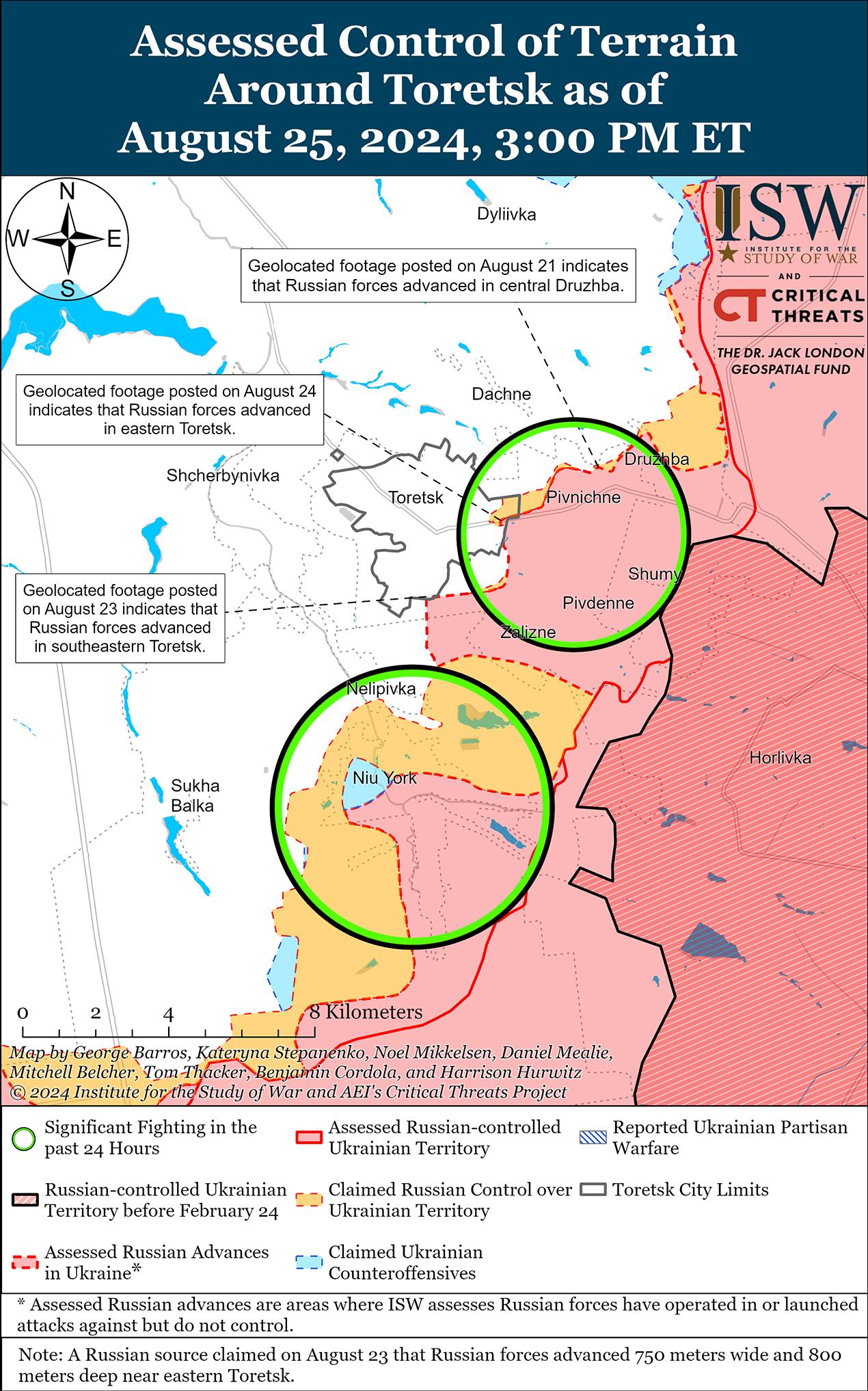 В последнее время российские войска продвинулись к северо-востоку и югу от Торецка и в восточных окрестностях Торецка. Геолоцированные кадры, опубликованные 25 августа, свидетельствуют о том, что в последнее время российские войска продвинулись дальше вдоль восточных окраин Торецка. [42] Опубликованные 24 августа геолоцированные кадры свидетельствуют о том, что в последнее время российские войска продвинулись на запад через канал Северский-Донец Донбасс к югу от Озаряновки (к северо-востоку от Торецка) и далее в восточной и центральной части Нью-Йорка (к югу от Торецка). [43] Российский военный блогер утверждал, что российские войска продолжают продвигаться в восточный Торецк, но украинские оборонительные позиции и особенности местности замедляют российское наступление. [44] 24 и 25 августа российские войска продолжали наступательные действия вблизи Торецка, к северу от Торецка в районе Дилиевки, к востоку от Торецка в районе Дружбы и Северного, к югу от Торецка в районе Нью-Йорка и Нелиповки. [45]