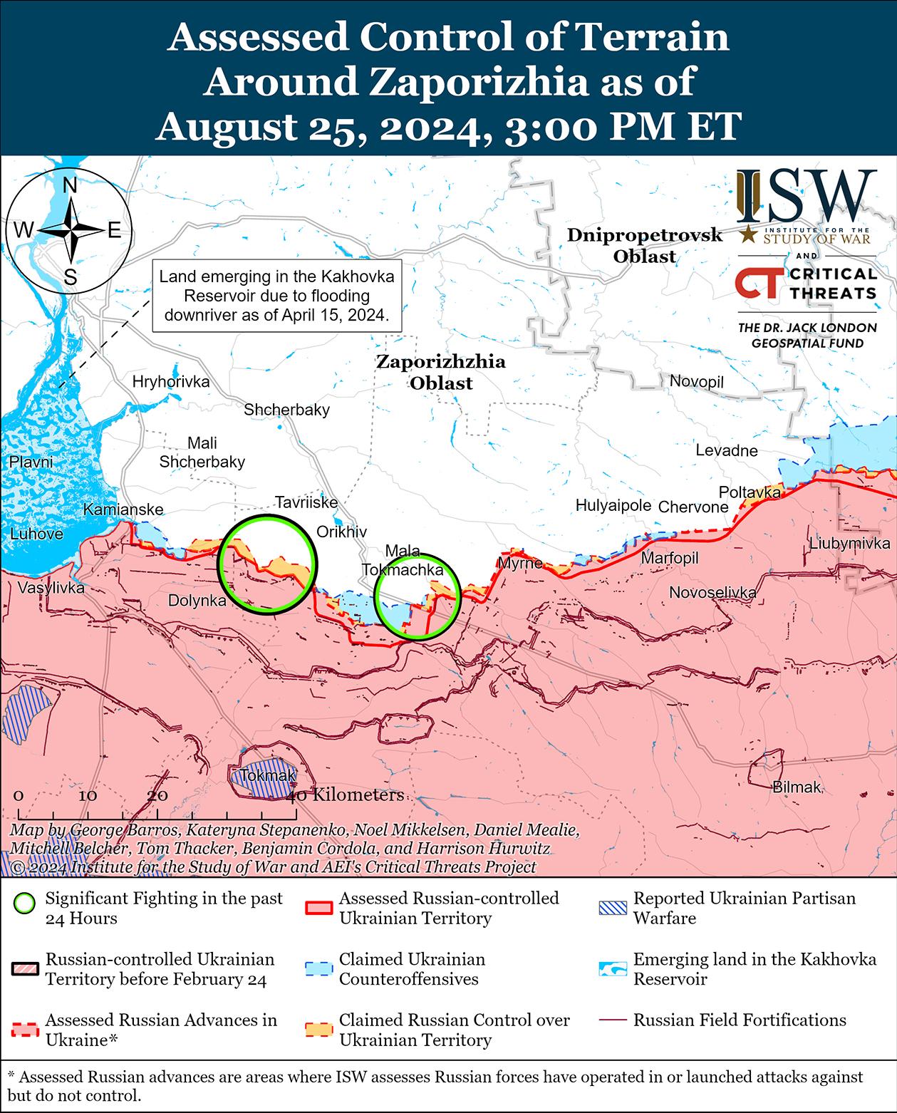 Бои продолжались на западе Запорожской области в районах населенных пунктов Новоандреевка и Щербаки (к северо-западу от Работино) и Малой Токмачки (к северо-востоку от Работино) 24 и 25 августа, но подтвержденных изменений на линии фронта не было. [53] Российские оккупационные власти утверждали, что украинские силы нанесли авиаудар по Васильевке (к юго-западу от Работино). [54] Сообщается, что на Запорожском направлении действуют подразделения российского 150-го противотанкового артиллерийского дивизиона (42-я мотострелковая дивизия, 58-я общевойсковая армия, Южный военный округ). [55]