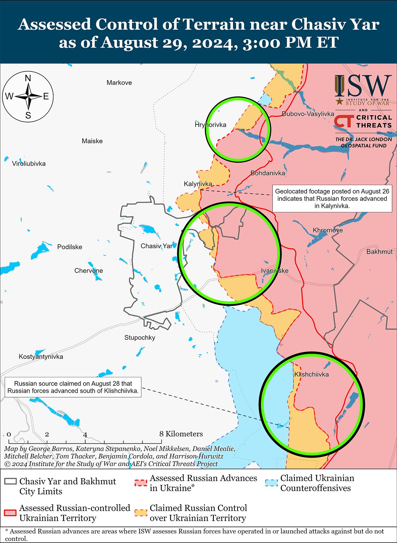 Враг продолжил наступательные действия в районе Часового Яра; к северу от Часова Яра в районе Григорьевки; восточнее Часова Яра в районе Ивановского; и к юго-востоку от Часова Яра в районе Клещеевки, Андреевки и Белой Горы 28 и 29 августа. [47] Сообщается, что подразделения российской бригады «Север-В» действуют вблизи Григоровки. [48]