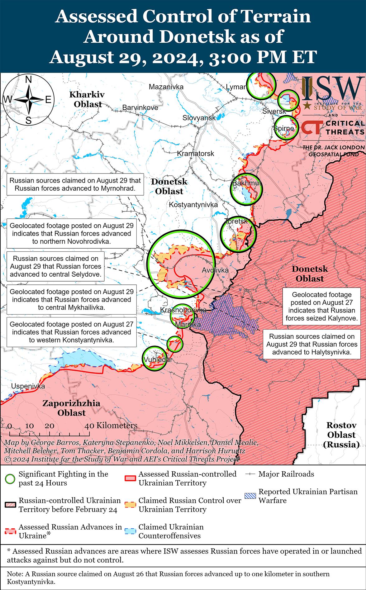 В последнее время российские войска продвинулись к востоку и юго-востоку от Покровска и 29 августа продолжили наступательные действия на Покровском направлении. На геолоцированных кадрах, опубликованных 29 августа, видно, что российские войска продвинулись к лесополосе к северо-западу от Свиридоновки (к востоку от Покровска), на север по полям к востоку от Гордовки (к востоку от Покровска), до шахты No 1/3 «Новогродовская» на северо-западе Новогродовки (к юго-востоку от Покровска) и на запад до террикона шахты «Россия» к северу от Михайловки (к юго-востоку от Покровска). [52] Российский военный блогер утверждал, что российские войска продвинулись дальше в северо-западной части Новогродовки, хотя ISW не зафиксировал подтверждения этого заявления. [53] 28 и 29 августа российские войска продолжили наступательные действия к востоку от Покровска в районе Воздвиженки, Зеленого Поля, Миролюбовки и Гродовки и к юго-востоку от Покровска в районе Новогродовки, Мариновки, Михайловки, Селидово, Карловки, Галицыновки и Украинска. [54]